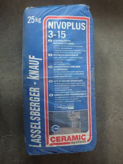 Nivoplus 3-15 je samonivelirajuća cementna masa za izravnavanje mineralnih podloga u debljini 3 do 15 mm. Prohodna nakon 5 sati.