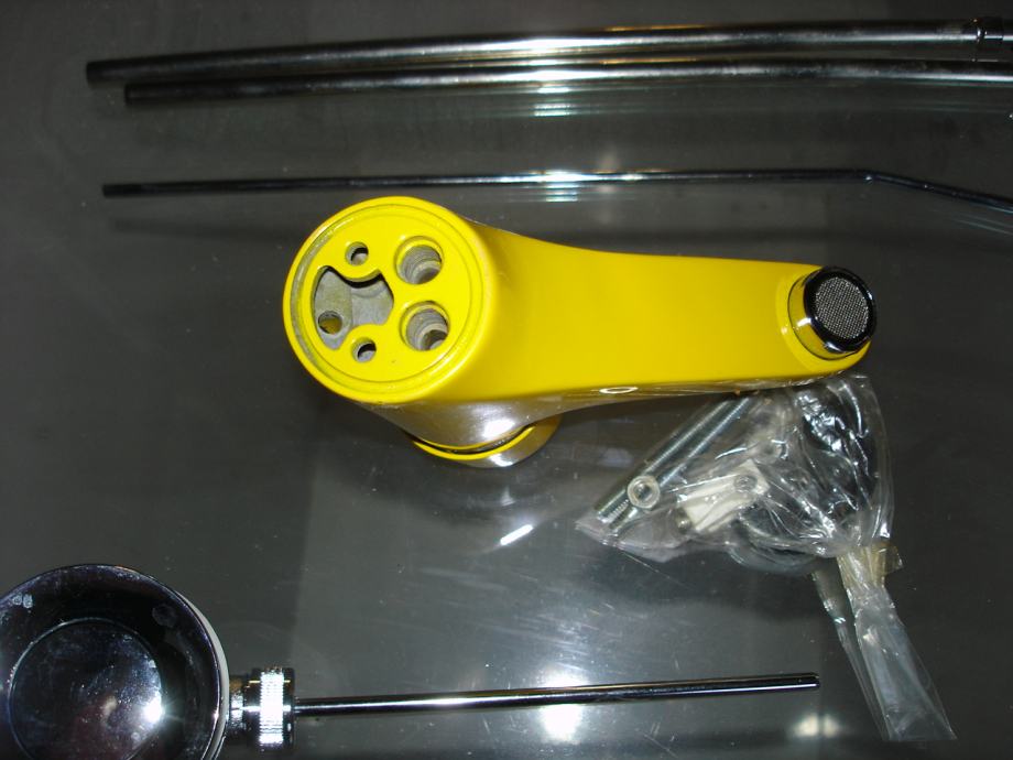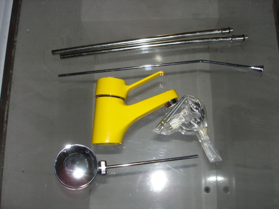 Nova jednoručna slavina -mješalica za umivaonik komplet sa priključnim cijevima i gornjim dijelom odvoda. Žuta plastificirana s kromiranim detaljima. Top kvaliteta Original Made in Italy u pola cijene nove. kontakt poziv ili njuškalo poruka