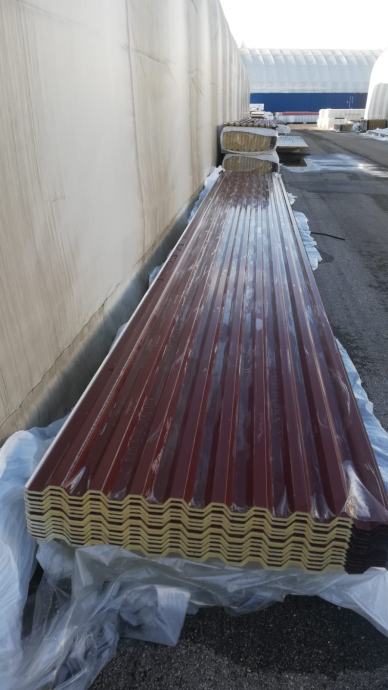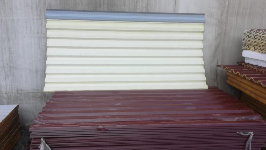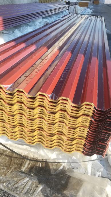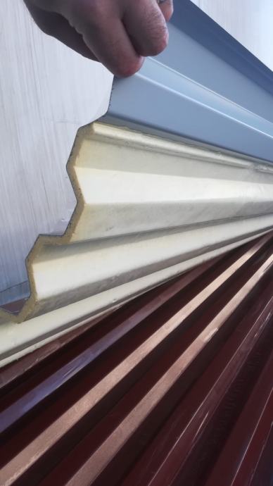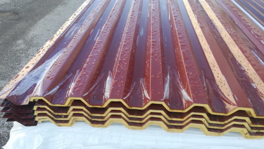 S DONJE STRANE PLOČE JE 10 MM PUR IZOLACIJE KOJA JE VIDLJIVA S DONJE STRANE I PRATI OBLIK VALA. OVIH 10 MM PUR IZOLACIJE SPREČAVA POJAVU KONDENZATA (POJAVU KAPLJICA S DONJE STRANE PLOČE) KOJI ONDA PADA U PROSTOR ISPOD PLOČE ŠTO JE ČESTA POJAVA KOD TRAPEZNOG LIMA BEZ IZOLACIJE.