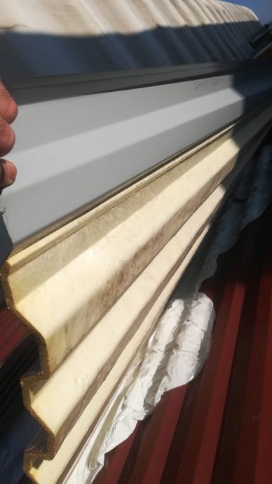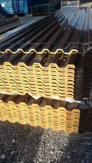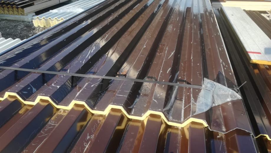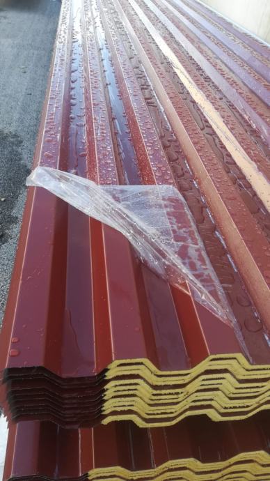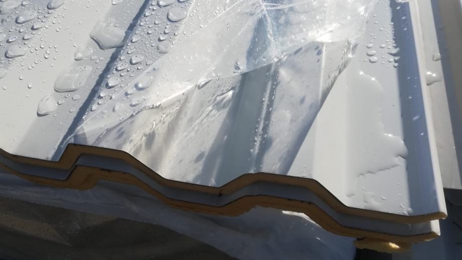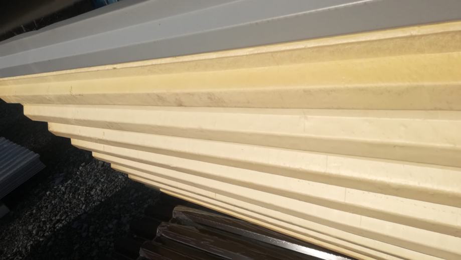 S DONJE STRANE PLOČE JE 10 MM PUR IZOLACIJE KOJA JE VIDLJIVA S DONJE STRANE I PRATI OBLIK VALA. OVIH 10 MM PUR IZOLACIJE SPREČAVA POJAVU KONDENZATA (POJAVU KAPLJICA S DONJE STRANE PLOČE) KOJI ONDA PADA U PROSTOR ISPOD PLOČE ŠTO JE ČESTA POJAVA KOD TRAPEZNOG LIMA BEZ IZOLACIJE.