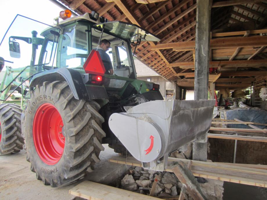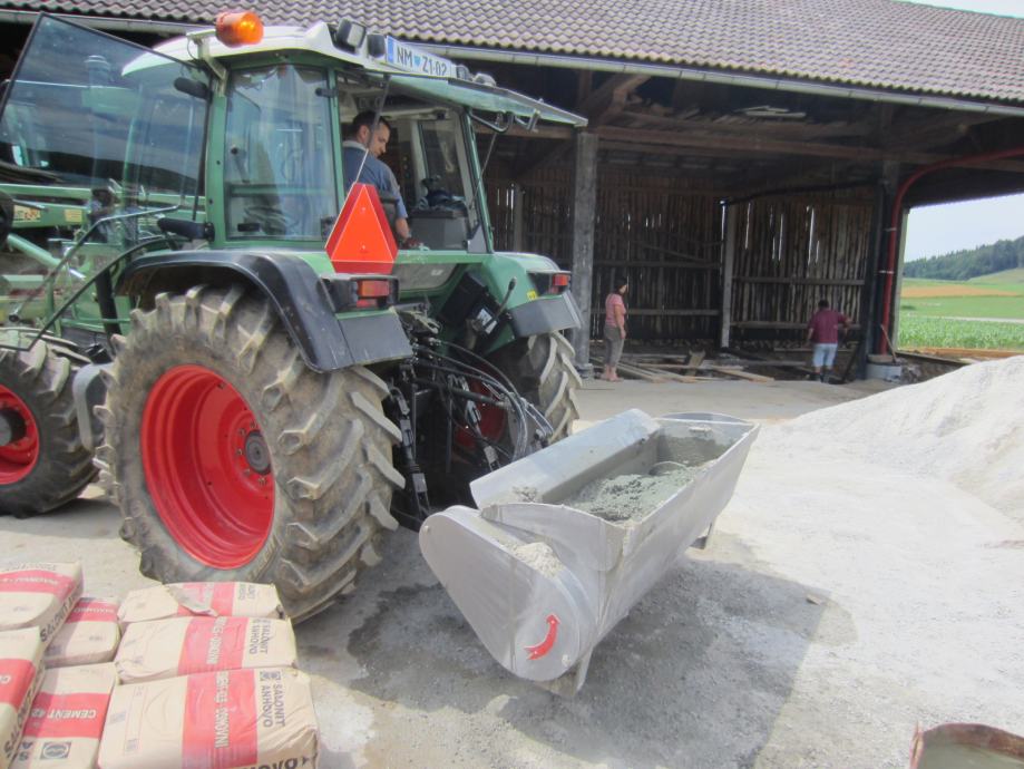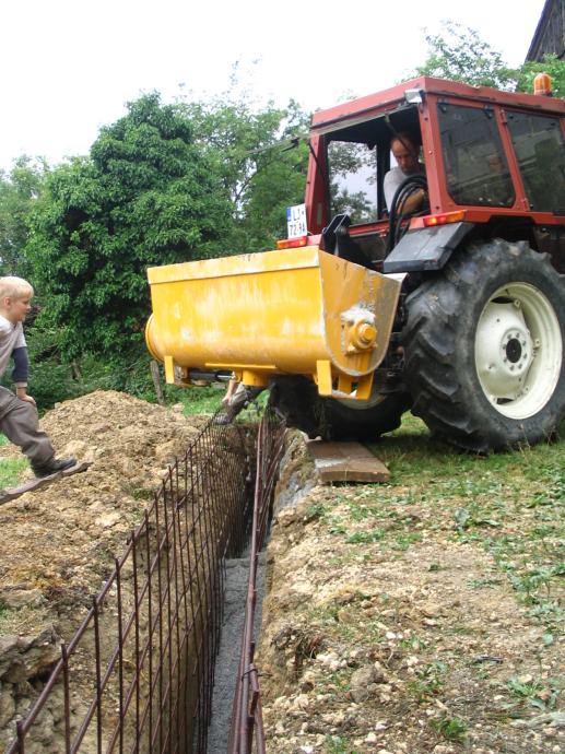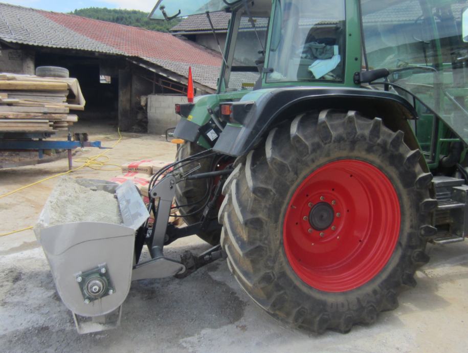 Miješanje betona traktorom na gradilištu, u polju, u šumi, na farmi, u brdima i planinama. Geometrija pričvršćenja korpe za miješanje za skupljanje pijeska i ispuštanje betona dizajnirana je za svaki vaš traktor.