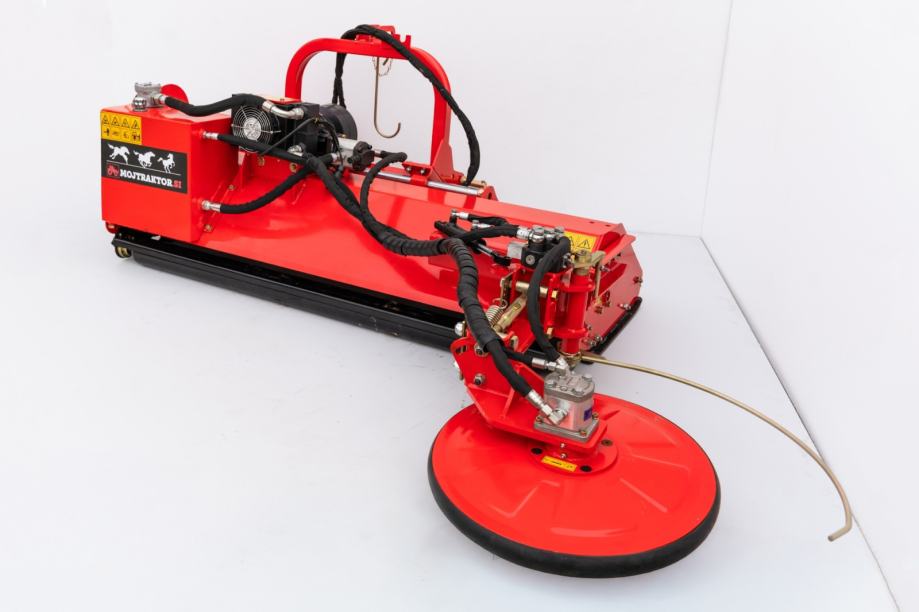 Osnovna radna širina malčera iznosi 175 cm, dok dodatni bočni disk širine 60 cm omogućuje preciznu košnju između redova i uz debla. Disk je hidraulično pomičan, što znači da se pri kontaktu s preprekom automatski pomakne te se nakon prolaska vraća u radni položaj. Takvo rješenje omogućuje neometan i siguran rad čak i u gustim vinogradima, voćnjacima te nasadima lješnjaka, borovnica, brusnica, malina, ribiza i aronije.
