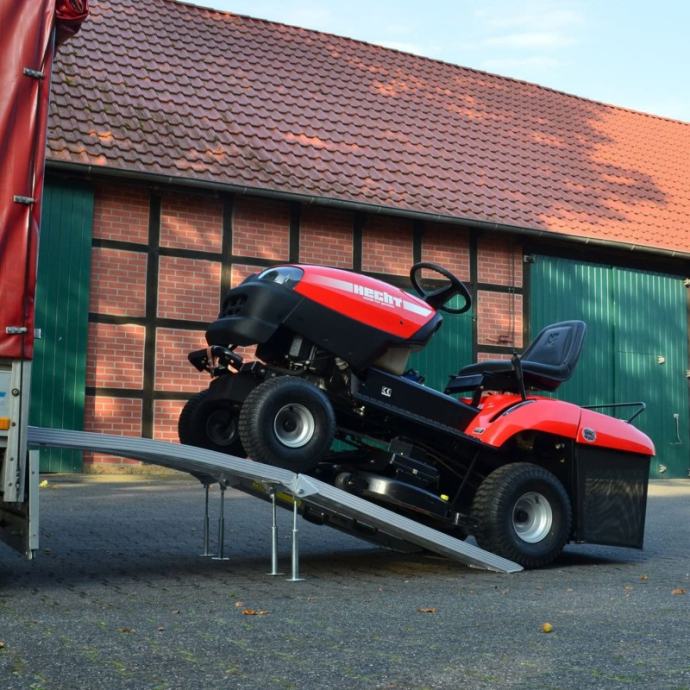 HECHT 005005 utovarne rampe su sklopive i izrađene od aluminija. Nosivost im je 680 kg. Dužina rampi je 225 cm, a širina 28 cm. Kada su rampe sklopljene, one zauzimaju 114 cm. Utovarne rampe imaju svestrane namjene, a najčešće se koriste za utovar ATV-a, 4-kotača, kosilica, lakih građevinskih i poljoprivrednih strojeva,... Isporuka samo u paru, cijena se odnosi na par.