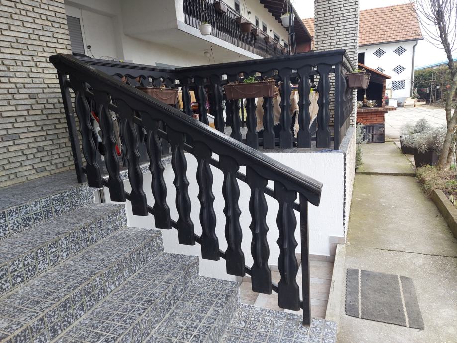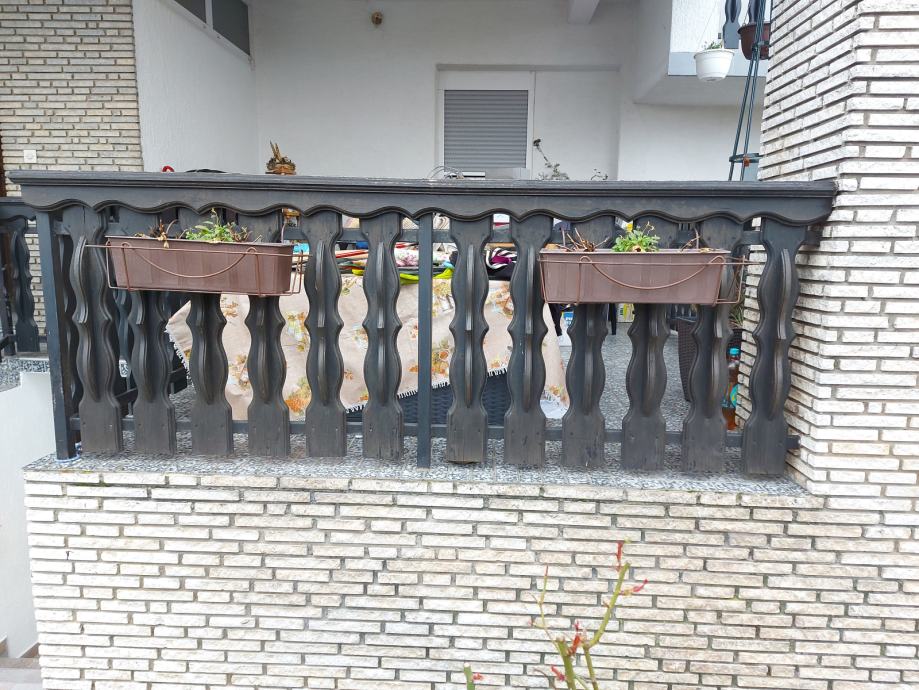 Prodaje se drvena ograda, montirana na željeznu konstrukciju. Letvice su dekorativane i pofarbane u crnu boju.