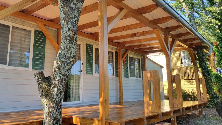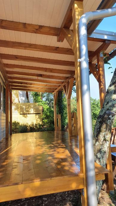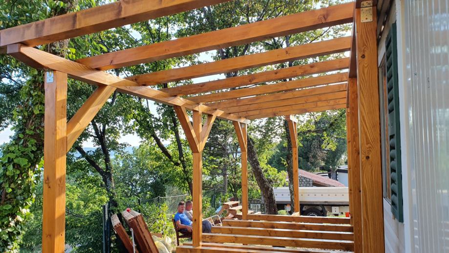 Izrađujemo nadstrešnice ispred kamp kućica, sa betonskim stopama ili bez njih, slike u prilogu. Konstrukcija lamelirane grede, pod debljine 35 mm, krov od brodskog poda, sa folijom, pokrov lim. Po dogovoru izolacija krova kamenom vunom. Dodatno još možete naručiti ogradu, stepenice, sjenila i sl. Za sva pitanja 099/44 66 971