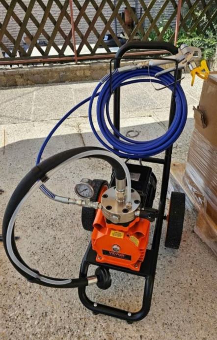 Airless uređaj za prskanje VEVOR Stand 230 V Airless uređaj za prskanje VEVOR s motorom na četkice je robustni uređaj za profesionalnu uporabu u svakodnevnoj upotrebi. Idealan je za upotrebu u stambenim zgradama. Za jednostavno prskanje standardnih lakova, akrilnih boja, primera, emajl lakova i glazura. Opremljen je sa sustavom zamjene pumpe ProConnect, dokazanom tehnologijom pumpe Endurance kao i filterom pumpe Easy-Out. Okretni usisni otvor: uklanjanje crijeva bez alata - za jednostavno čišćenje ulazne kugle.