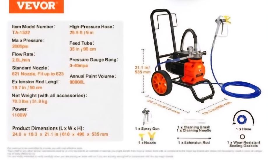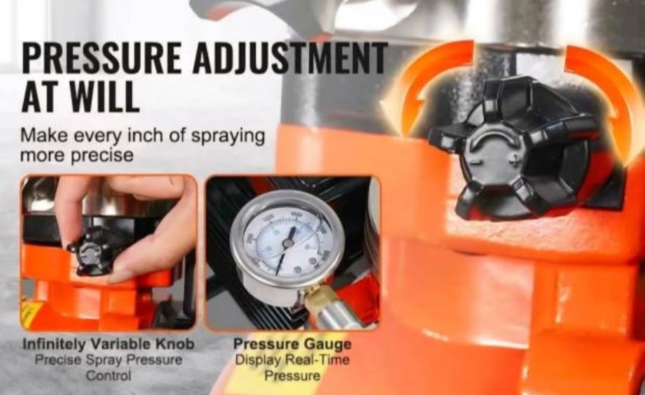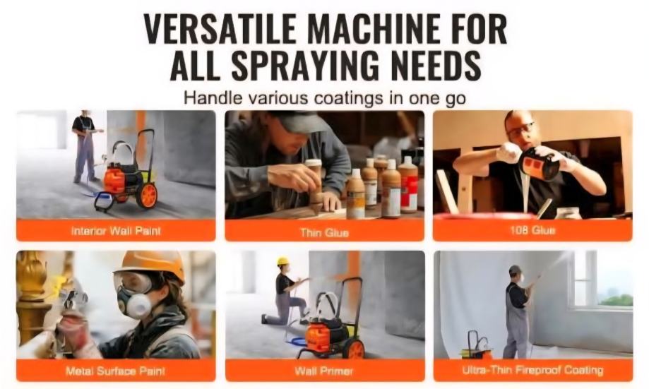 Visokoučinkovito prskanje: Opremljen snažnim motorom od 1100 W, bezračni raspršivač boje montiran na kolica isporučuje tlak do 2000 psi, brzo pokrivajući velike površine. S maksimalnim protokom od 2,0 L/min, osigurava kontinuirano i glatko nanošenje, što ga čini 5 puta bržim od valjka i 12 puta bržim od nanošenja četkom, savršenim za srednje do velike poslove prskanja.