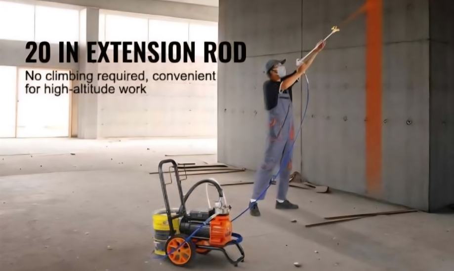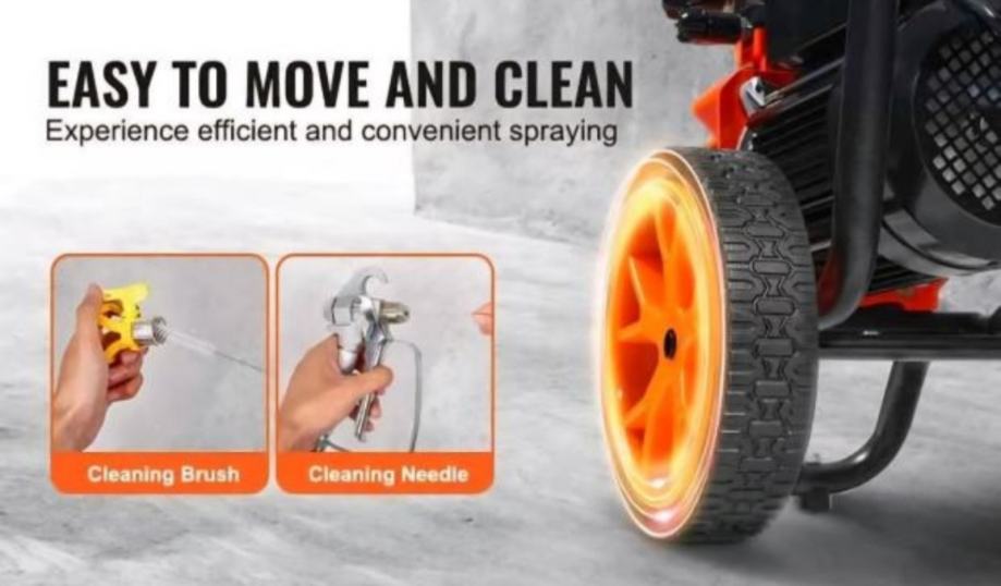 Jednostavna mobilnost: Dizajniran s kotačima, ovaj bezzračni raspršivač boje može se lako premještati na različita radna mjesta bez puno napora, idealan za velika ili često promjenjiva radna okruženja. Udobna ručka učinkovito smanjuje umor.