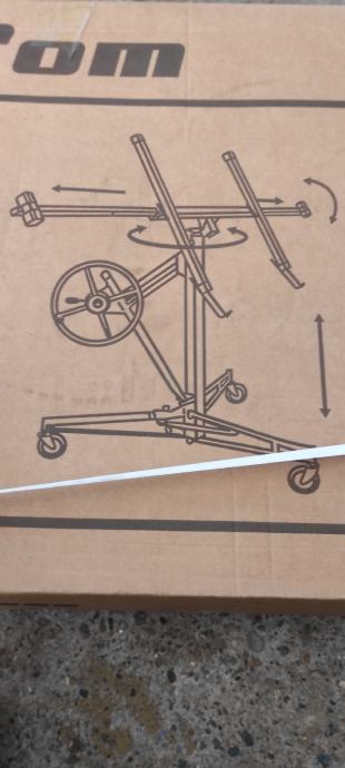 Prodajem dizalicu tereta, ploča,profila i dr. na okretnim kotačima i regulirajučom platformom za kosine, sa reg..graničnicima za ploče.Vrtnjom koluta ,ručke, podiže se teret, ploča,ili dr. do potrebne visine i mjesta ugradnje. Cijena 399 e.Potrebno osobno preuzimanje,sa prijevozom. zbog težine ,komplet je u kutiji ali je pojača konstrukcija.nije iz pleha kao kod konkurencije.