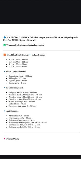 Firma Primorac oplate specijalizirana tvrtka za prodaju građevinske opreme sa najpristupacnijm cijenama u Hr . Prodajemo katnu oplatu marke Doka Framax,Frami(laki čelik),Frami(aluminijski)sa pratećom opremom.