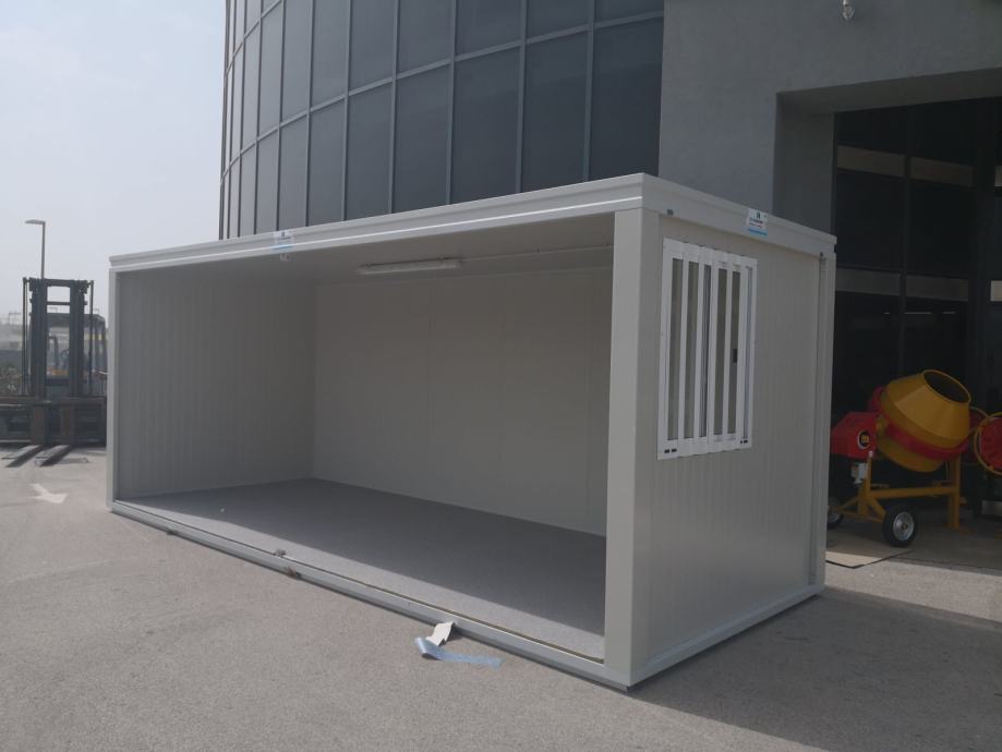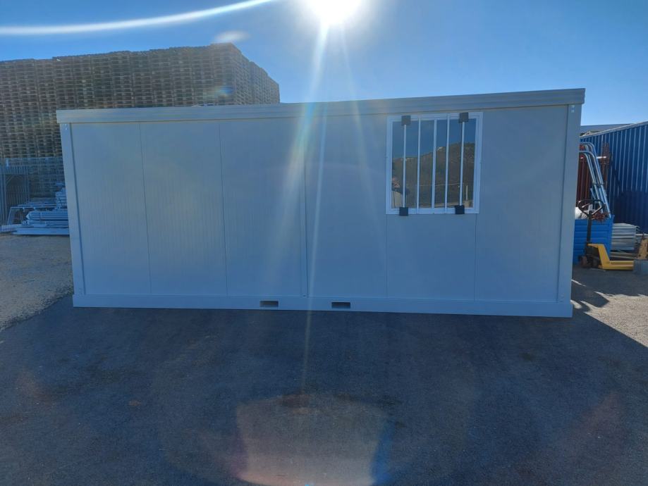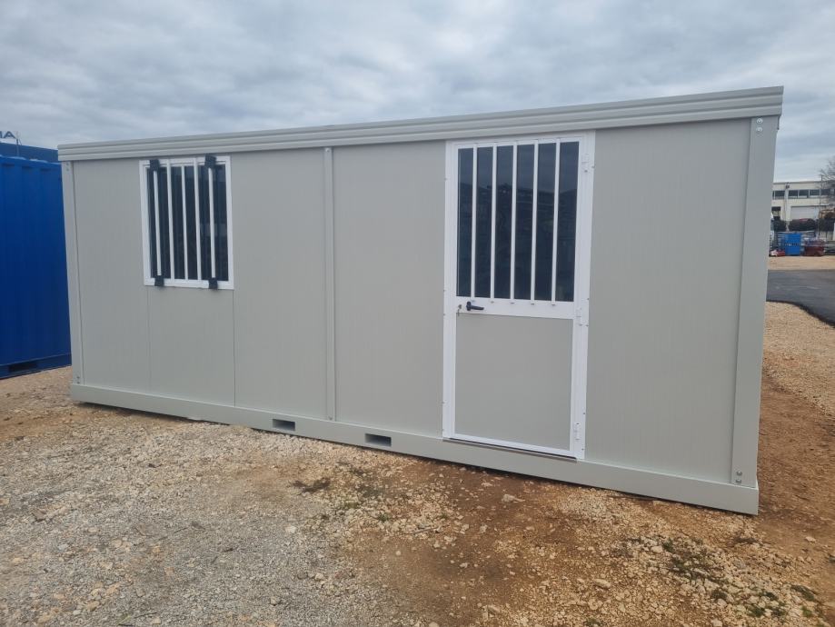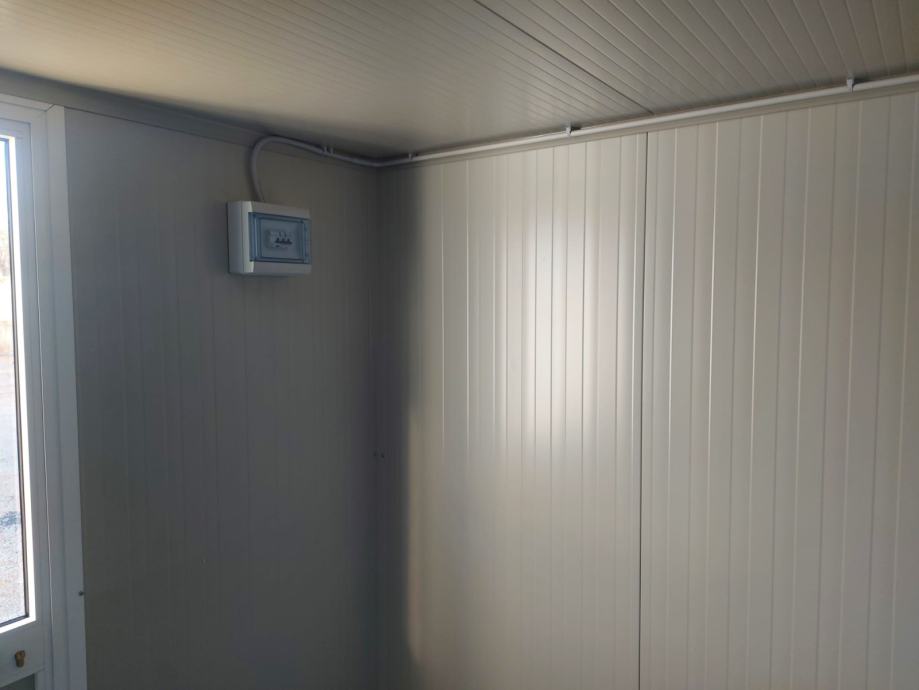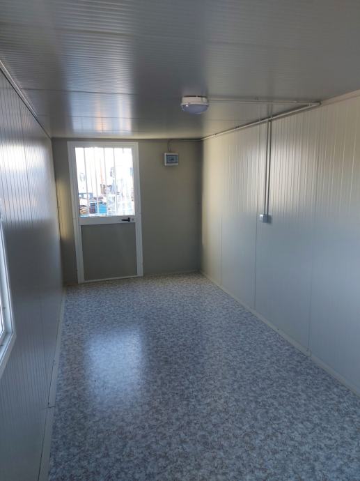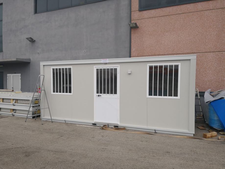 Kontejneri uredski, prozor alu, vrata alu sa ostakljenjem, rešetke na zatvorima, sandwich izo panel 40 mm, pocinčana konstrukcija, el. instalacija (svjetlo, prekidač, utičnica, fi sklopka, osigurači, vanjska priključna kutija, mjesto za uzemljenje, prolazi za podizanje viljuškarom.