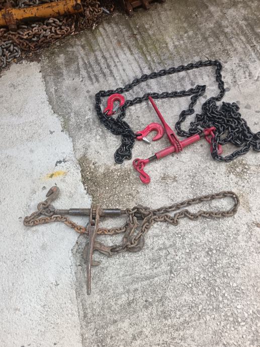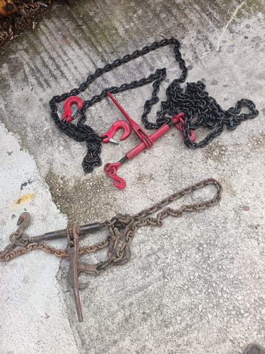 LANCI ZA VEZIVANJE TERETA SA ZATEZAČIMA (ŠPANERIMA) DEBLJINE 10MM JEDAN DUŽINE 6M,A DRUGI 2M. LANAC DUŽINE 6M JE NOVI.