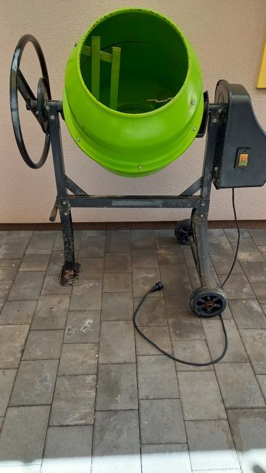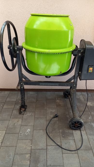 Prodajem električnu mješalicu za beton na kotačima. Radi se o kompaktnoj mješalici s bubnjem zelene boje, metalnim okvirom i elektromotором smještenim sa strane. Kotačići omogućuju lako premještanje s mjesta na mjesto. Stroj se uključuje prekidačem i spaja na struju standardnim kabelom.