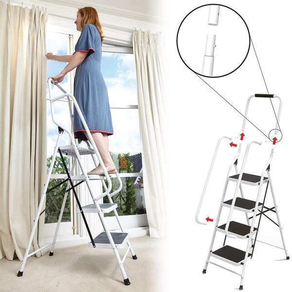 Penjanje po ljestvama često je povezano s nelagodom i vrtoglavicom. Ove sigurnosne ljestve imaju sigurnosne ograde s obje strane, za koje se možete čvrsto držati prilikom penjanja i spuštanja. S protukliznim gumenim površinama stojite udobno i sigurno. Osim toga, gumene nožice osiguravaju da ljestve ne skliznu. Idealan pomoćnik u kućanstvu, npr. ako vam treba nešto s gornje police, prilikom čišćenja prozora, vješanja zavjesa ili ukrasa itd.
