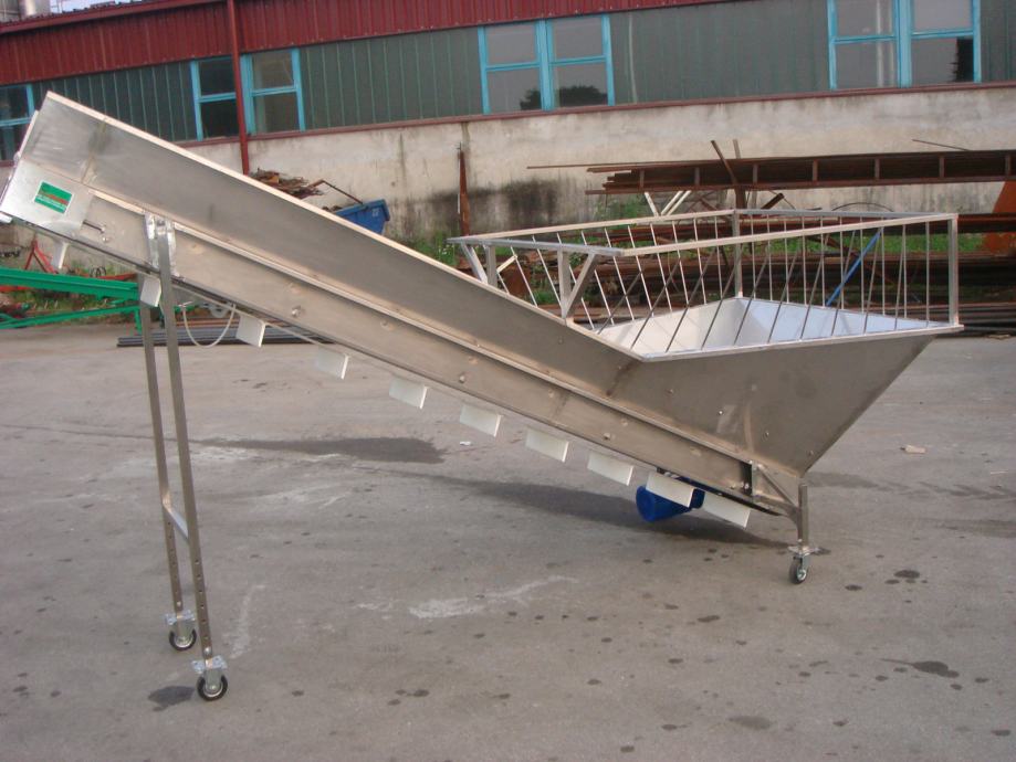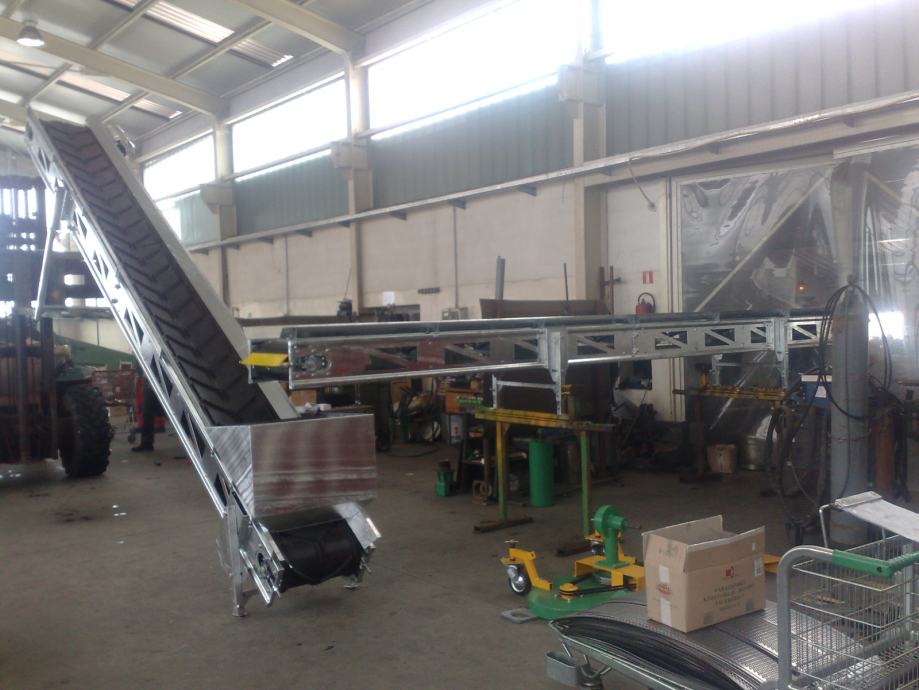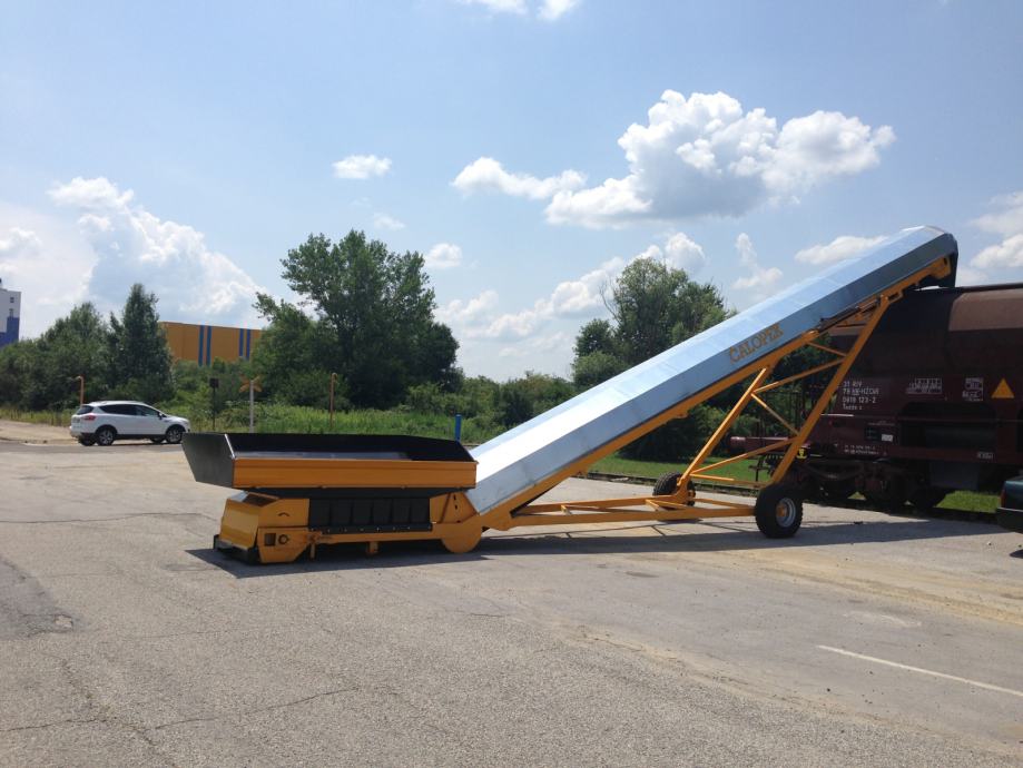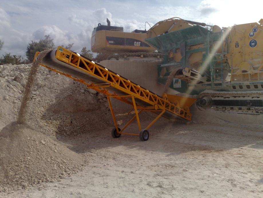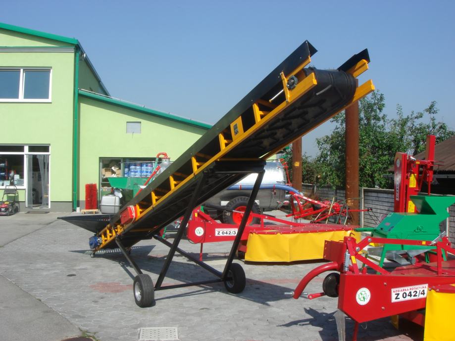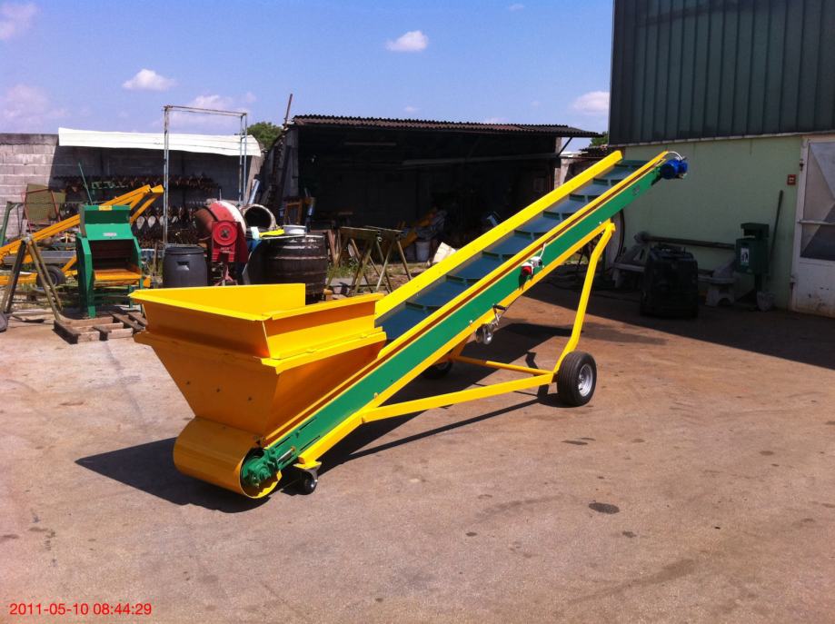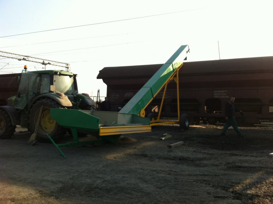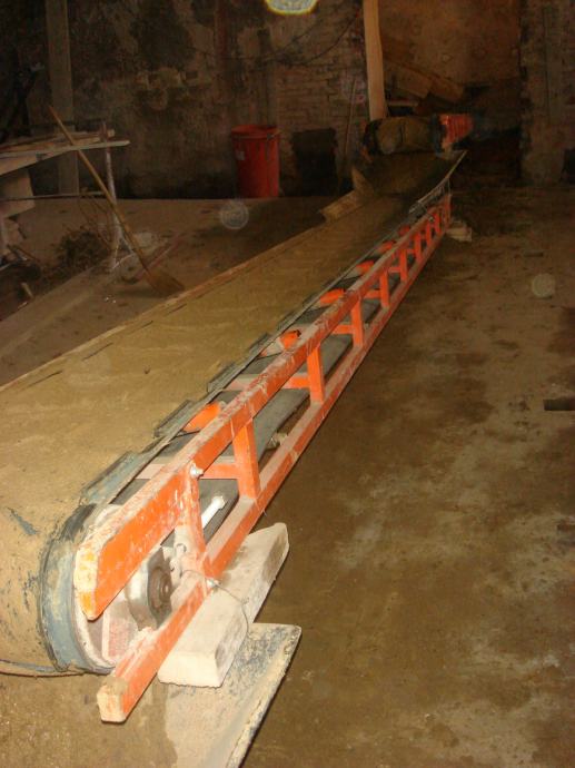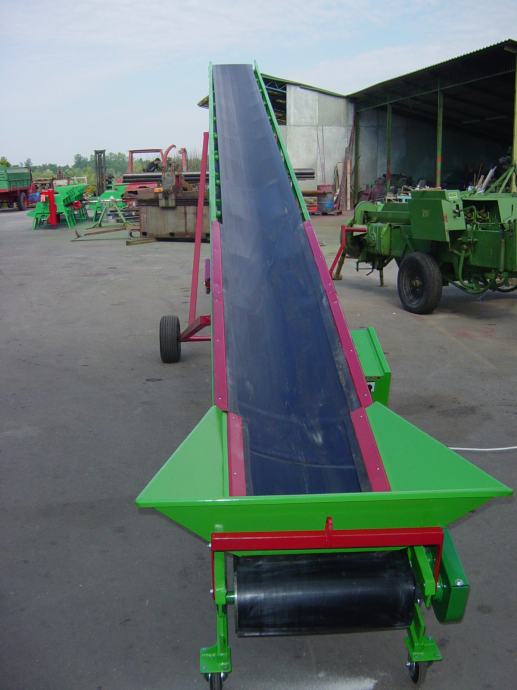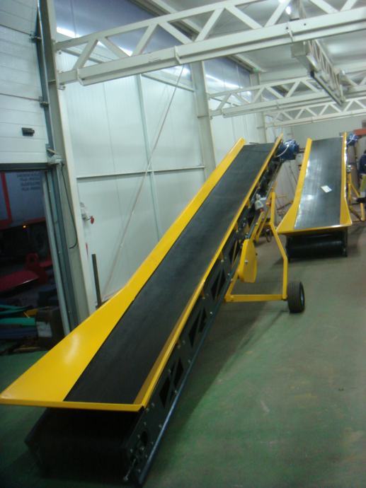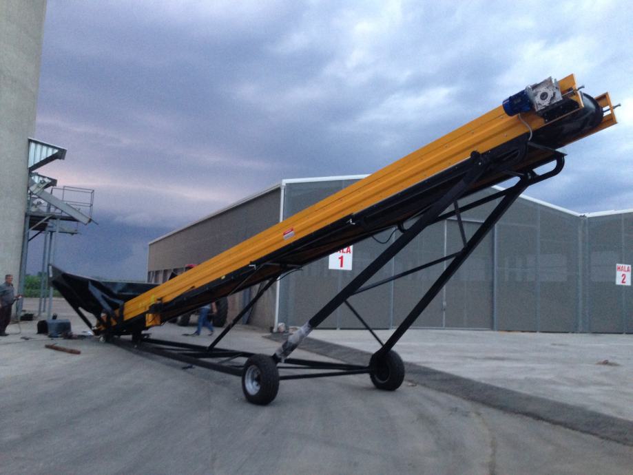 Transportna traka za prijenos materijala (šute, zemlje , žitarica i dr.) na željeznoj nosivoj konstrukciji, duljine po želji naručitelja, opremljena sa: