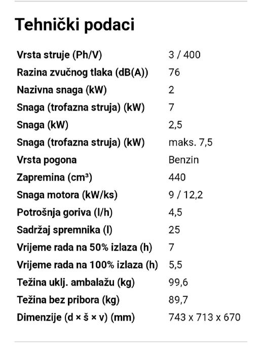 Nekorišteno, alnaser, trofazni. 7.5 kW, jedna trofazna utičnica i dvije jednofazne te priključak za 12 V istosmjernu struju