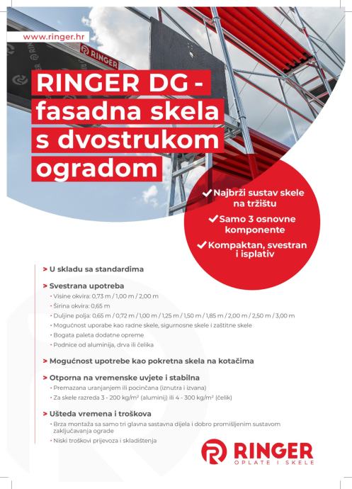 Skele RINGER nude najvišu kvalitetu materijala. Osmišljene su u skladu sa standardima, a njihova je primjena u potpunosti sigurna. Statički ispitane konstrukcije neprestano se nadgledaju i strogo ispituju. Pouzdane posebne brave kao patentirani sustav brzog zaključavanja RINGER i odsustvo nepotrebnih sitnih dijelova omogućuju brz i ekonomičan rad.
