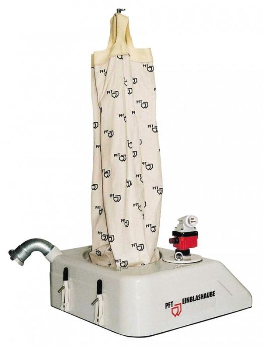 PFT hauba Mono E1 komplet s mono filterom, ugrađenim pokazivačem razine punjena i 75m upravljačkog kabla (1 x 50m, 1 x 25m) za priključivanje na PFT silomat. Pojedini PFT silomati upravljaju se automatski s ugrađenim pokazivačem razine punjenja u PFT haubi.