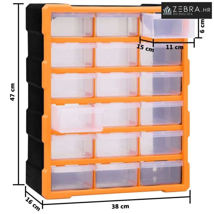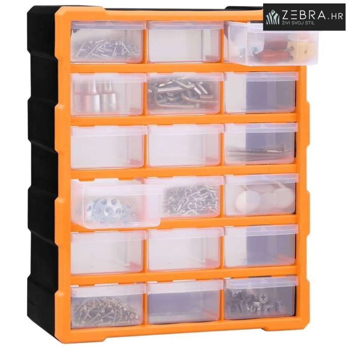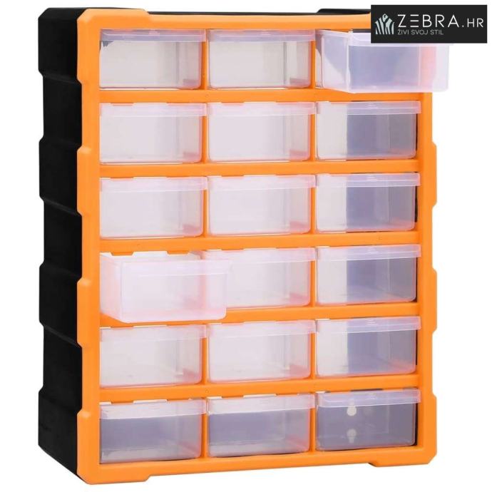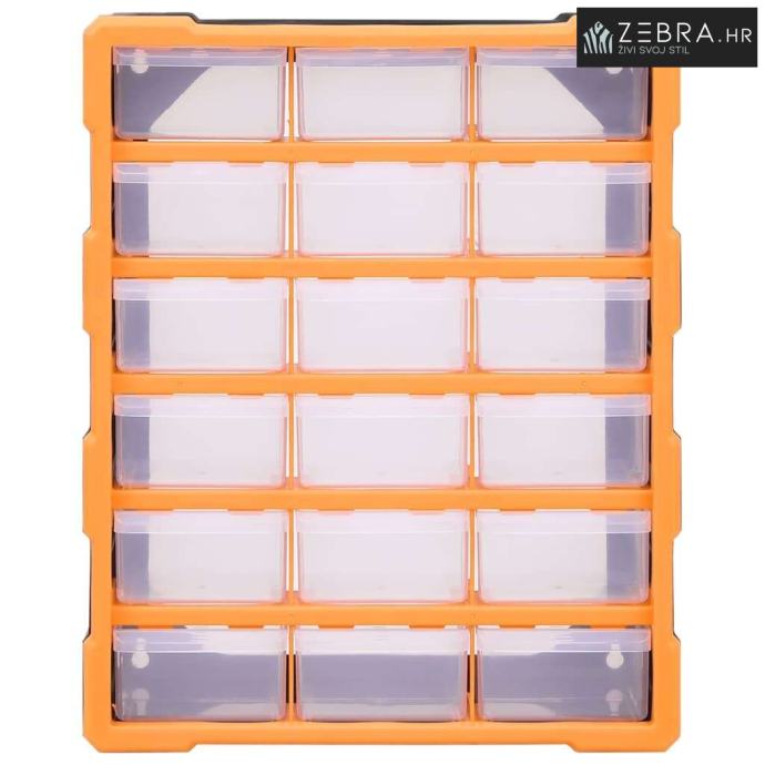 Ovaj neophodni organizator s ukupno 18 srednjih ladica dizajniran je za uredno spremanje širokog izbora predmeta. Može se upotrebljavati i kao kutija za šivaći pribor ili za čavle.