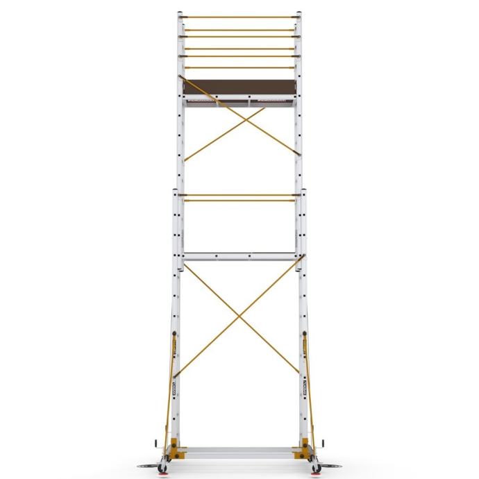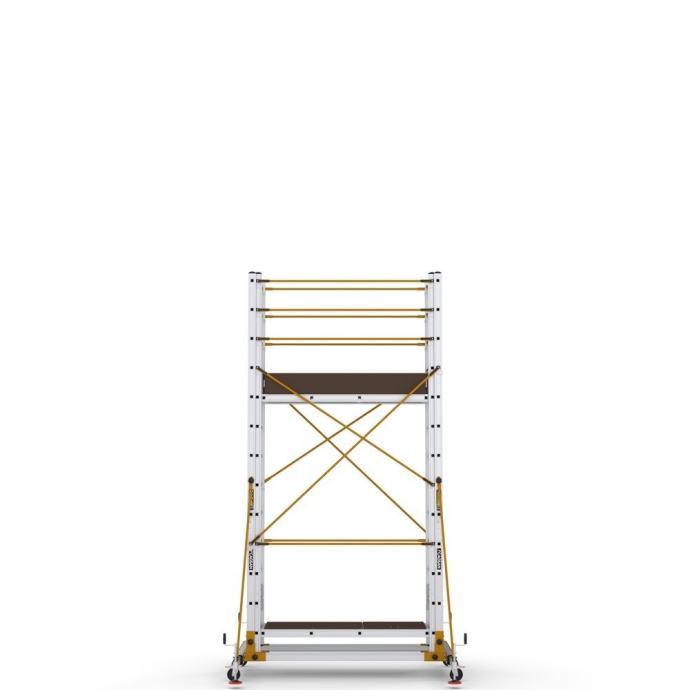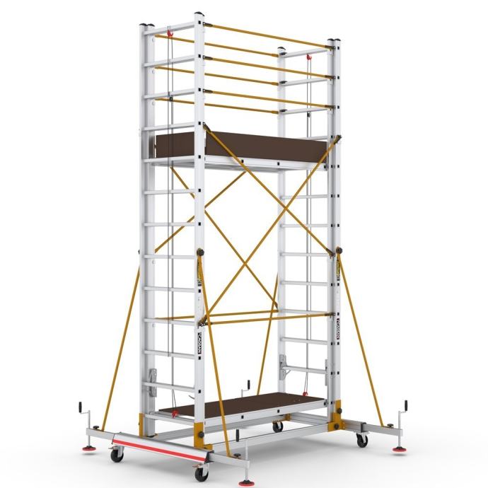 Dijagonalne i vodoravne prečke izrađene od željeznih cijevi povezuju glavne ljestve skele. Zahvaljujući Q-Lock sustavu može se instalirati vrlo brzo i sigurno. Visina platforme i visina skele mogu se podesiti svakih 28 cm zahvaljujući sustavu konopa i remenica. Vrata platforme omogućavaju korisniku siguran pristup platformi. Zaštitne ograde visine 100 cm.