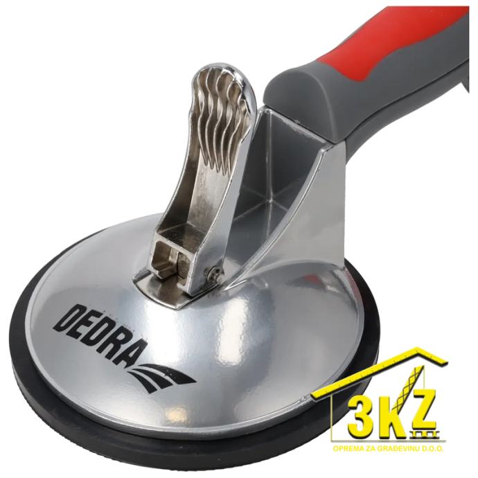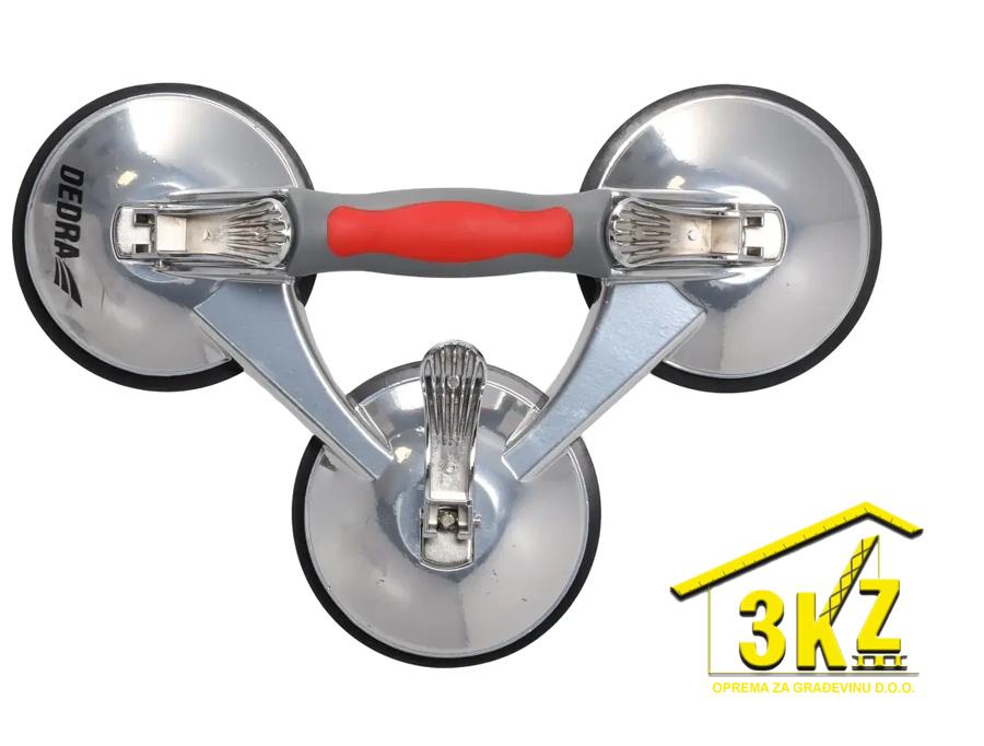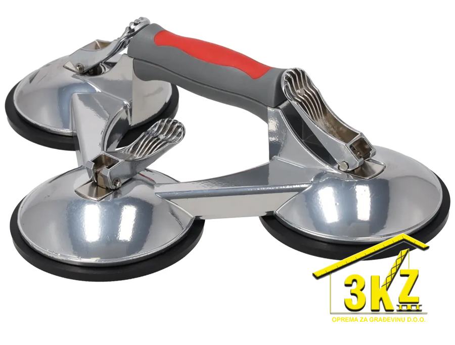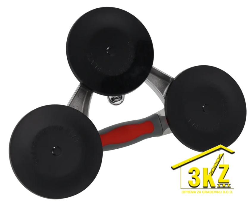 Trostruki vakuumski nosač za transport kamenih ploča, keramičkih pločica ili stakla. Tijelo vakuumske čašice izrađeno je od aluminija, što je čini laganom, ali vrlo izdržljivom. Osim toga, proizvod ima dvokomponentnu ručku kako bi se osigurala pouzdanost i stabilnost prilikom upotrebe.