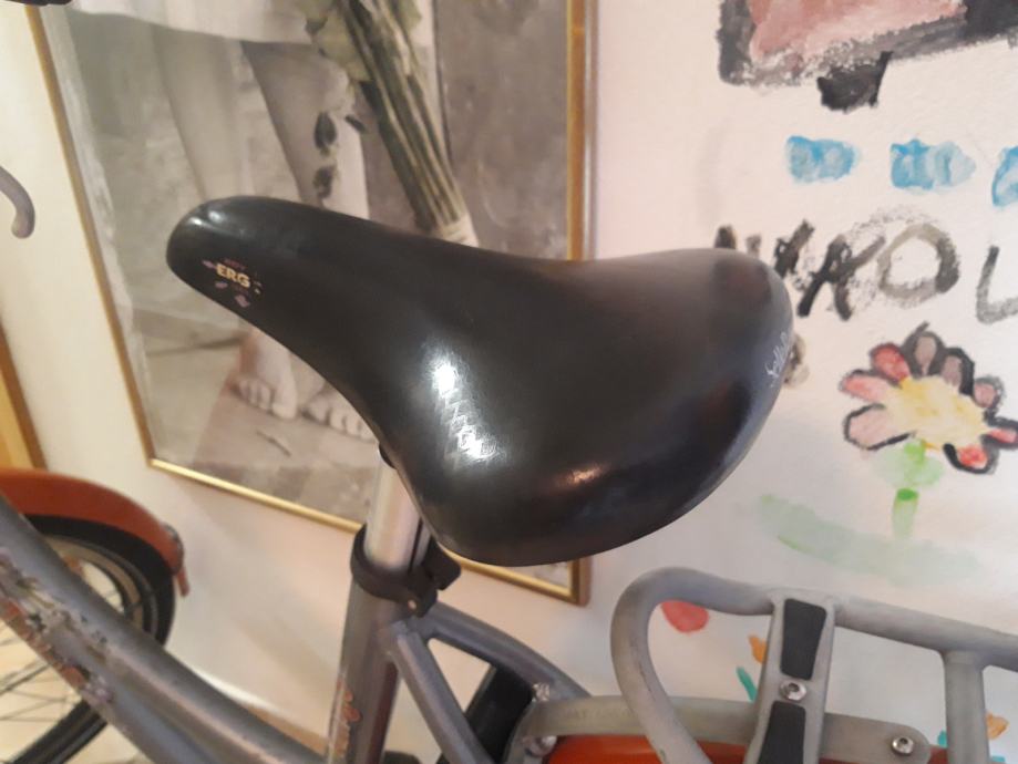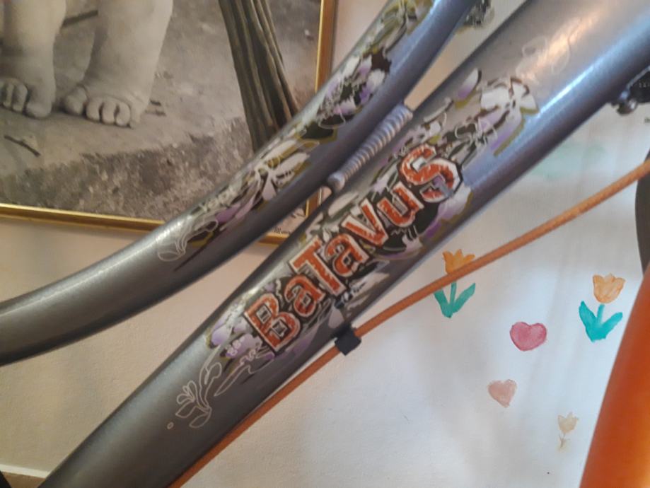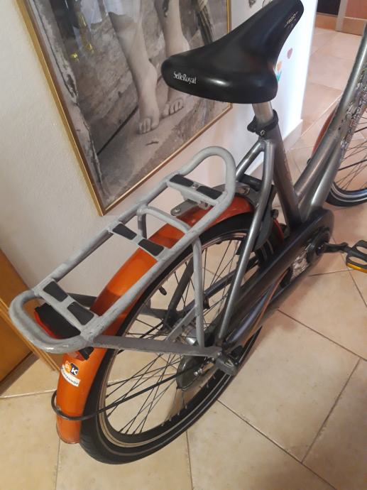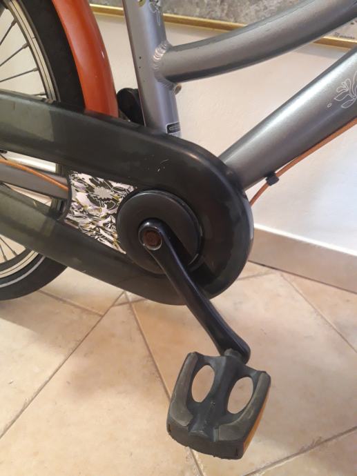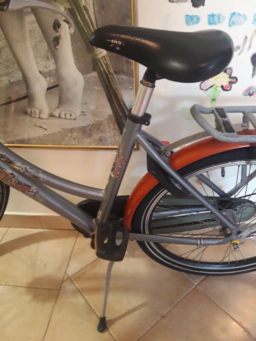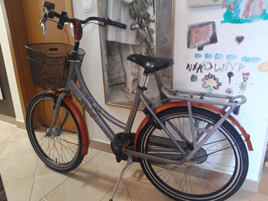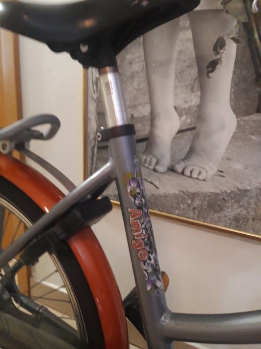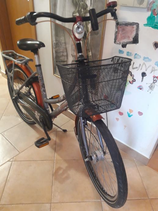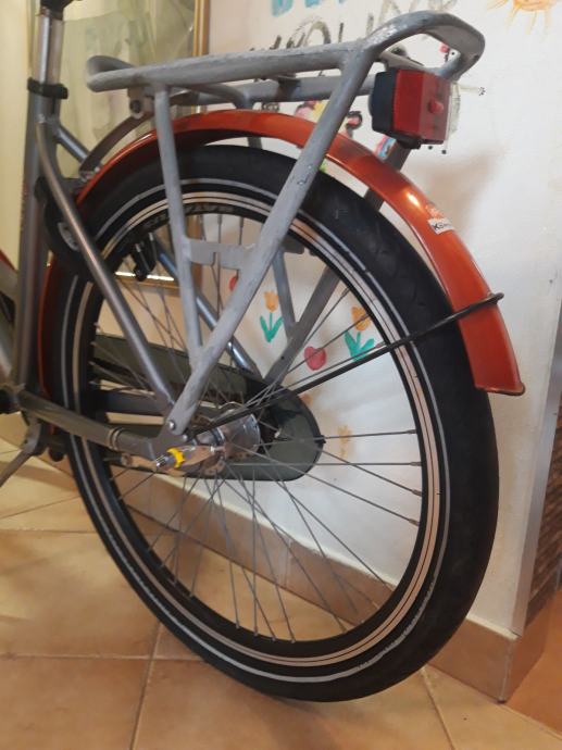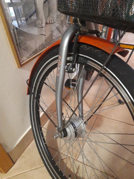 Dječji bicikl ali malo veći, BATAVUS AMIGO, Nizozemski bicikl u cijelosti aluminijski. Originalno stanje i vrlo malo vožen. Gume su kao nove. Alu felge BATAVUS duplo pojačane, osovine Shimano, mjenjač Shimano NEXUS 3 brzine, žice inox 2,2 mm, gume Continetal, rama Alu vrlo jaka, prtljažnik čvrsti alu, lancobran zatvara kompletno lanac, upravljač alu, svjetlo ppednje i zadnje, prednje se napaja dinamom u prednjoj osovini, nogar, zvono, košara. Sjedalo BATAVUS, kvalitetna cijev sjedala. Rama je titan srebrna metalik, blatobrani narancasti metalik. Plaćen je 540 eura u Njemačkoj prije 4 godine. Vožen je samo ljeti na godišnjem odmoru. Bicikl može voziti i osoba do 160 cm, a kada se sjedalo spusti djevojčica 125-130 cm i veća. Prodajemo ga za 220 eura. Mob 091 444 4281