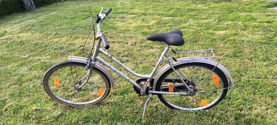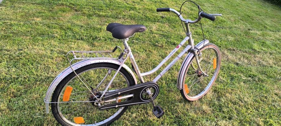 Prodajem gradski bicikl s 3 brzine i mjenjačem smještenim u zadnjoj osovini. Radi se o manjem city biciklu srebrne boje, opremljenom prtljažnikom na stražnjem dijelu i blatobranima.