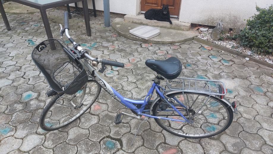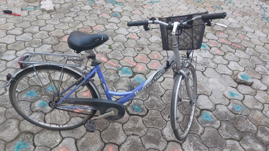 Prodajem ženski gradski bicikl Bottecchia plave boje. Radi se o klasičnom gradskom biciklu s ženskom geometrijom okvira, što znači niži prelaz koji olakšava sjedanje i silaženje. Bicikl dolazi opremljen košarom sprijeda i prtljažnikom straga, zvoncem te svjetlima. Kotači su standardne veličine, a upravljač i sjedalo su u klasičnom stilu prikladnom za gradsku vožnju.