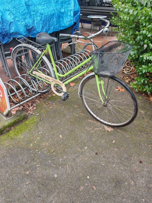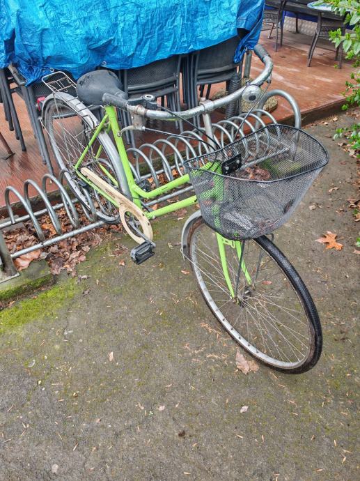 Stari bicikl rabljeni, zelene boje sa košarom. Probušena zadnja guma.