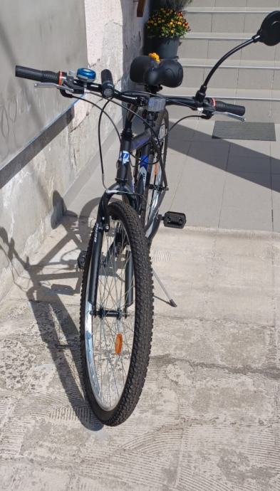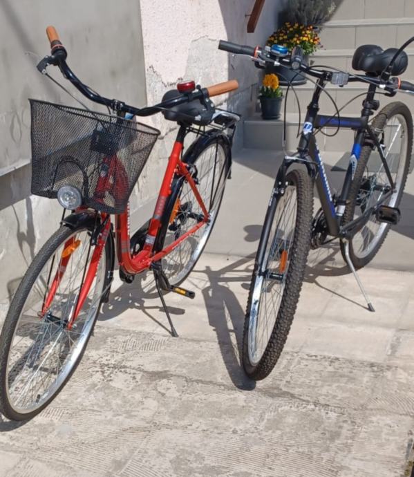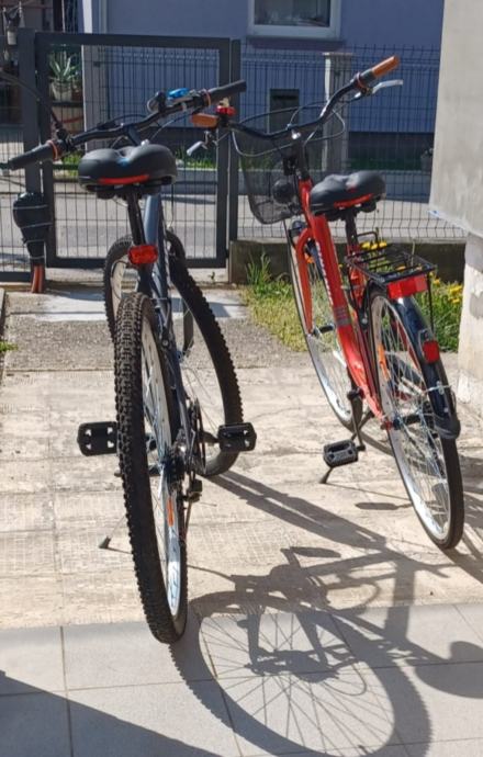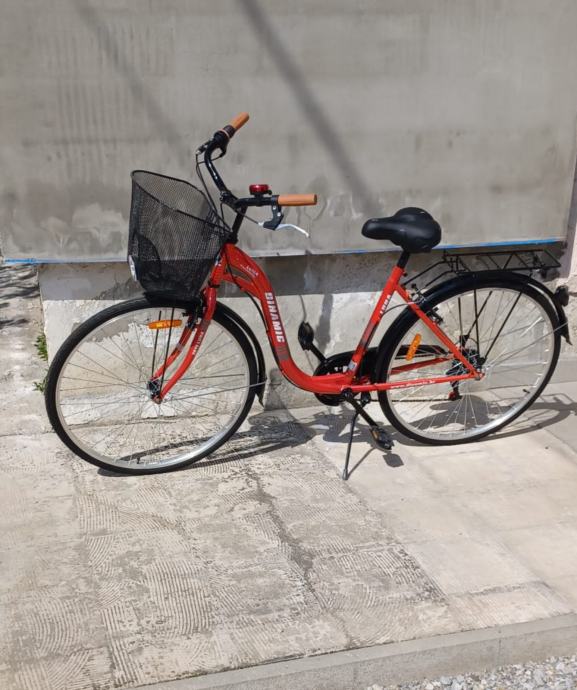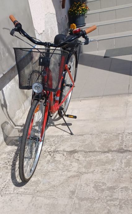 Prodajem nov gradski bicikl u crvenoj boji. Radi se o ženskom modelu s niskim okvirom, opremljenom prednjem košarom, stražnjim prtljažnikom, blatobranima i svjetlom. Upravljač ima ergonomske kožne drške, a bicikl dolazi s mjenjačem brzina. Uz to se prodaje i bicikl u crno-plavoj boji s 26-inčnim kotačima, mjenjačem brzina, retrovizorima i zvoncem.