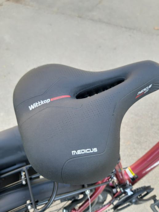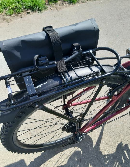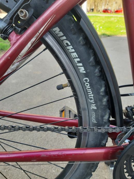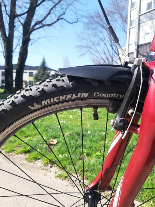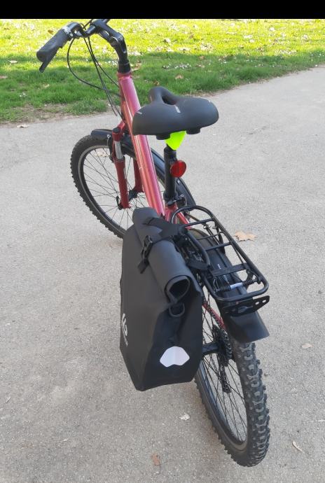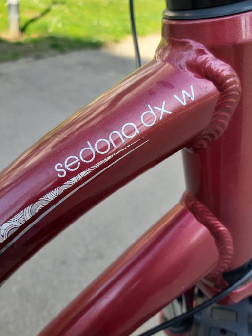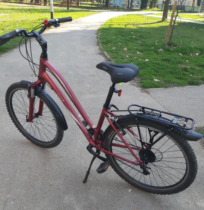 Ženski bicikl,GIANT SEDONA. Aluminijska rama i volan.detaljno servisiran. Podmazani lageri u oba kotača, pogonska osovina izvađena, očišćena i zategnuta. Kotači centrirani, dvostruki obruč, 26 cola.Lanac je u dobrom stanju. Promijenjen prošle sezone skupa sa kazetom. Novi gripovi, novi udoban gel sic. Nogica. Štanga sica ima amortizer za veću udobnost. Stavljen novi gepek na koji može ići košara ili torba kao na slici. TORBA SA SLIKE SE NE PRODAJE (nova je..i trebat će mi ali ako vam baš takva treba možemo se dogovoriti). Mašinica je ACERA, radi bez greške, brzine 3x8, gume MICHELIN, lula volana se može podešavati. Prednji amortizer radi odlično kao i amortizer sica. Svi dijelovi su solidni kao što je to uobičajeno na Giant biciklima. To bi spadalo pod cross bicikl. Malo je robusniji i čvršći od gradskih bicikala ali zbog kvalitetnog aluminija je relativno lagan i u kombinaciji sa ovim gumama odličan i za vožnju van ceste..makadam, zemlja.