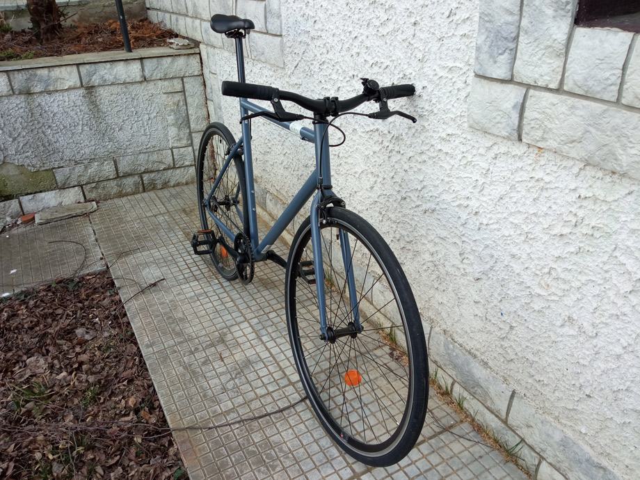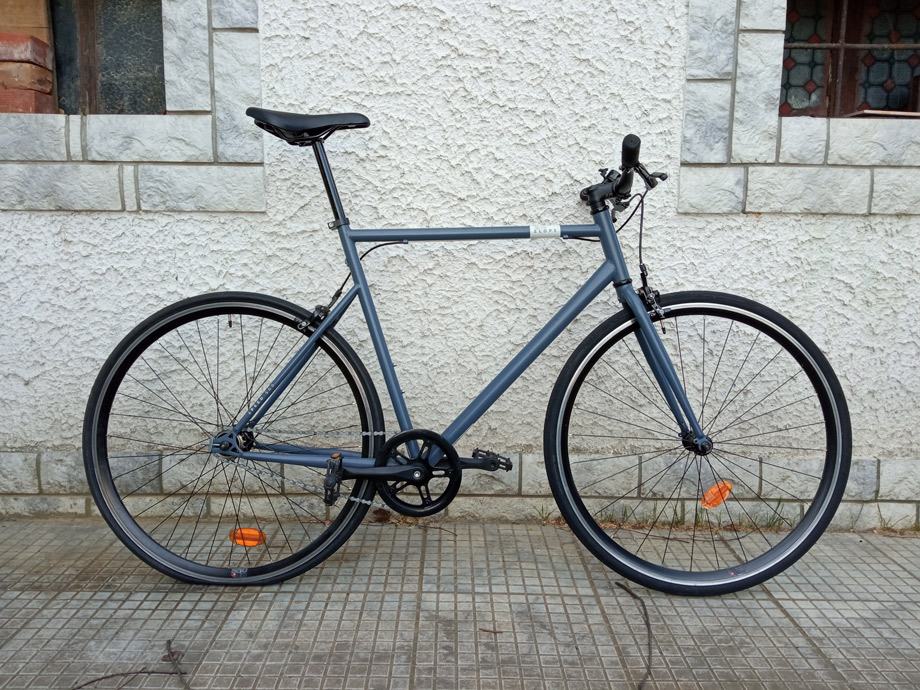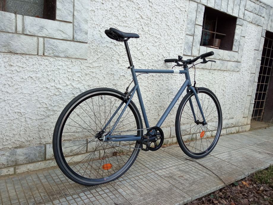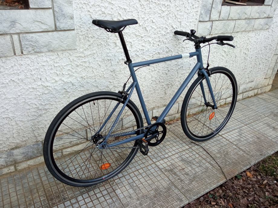 ELOPS SPEED 500 gradski single speed bicikl iz Decathlona. Veličina rame je 59 cm. Stražnja naba je flip/flop, pa je uz fiksni zupčanik moguć prelazak na fixie. Bicikl je kupljen prije godinu i 3 mjeseca i u odličnom je stanju jer je vrlo malo vožen, a kada vidite gdje živim bit će vam jasno i zašto.