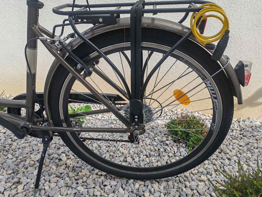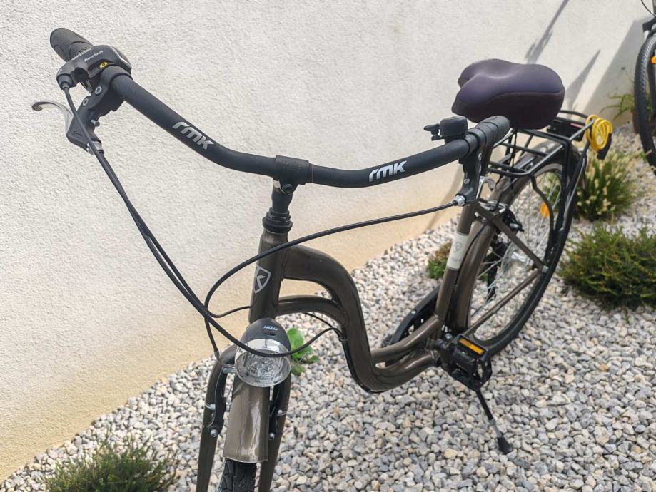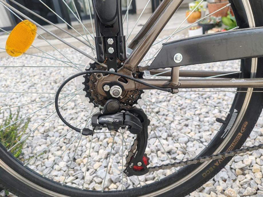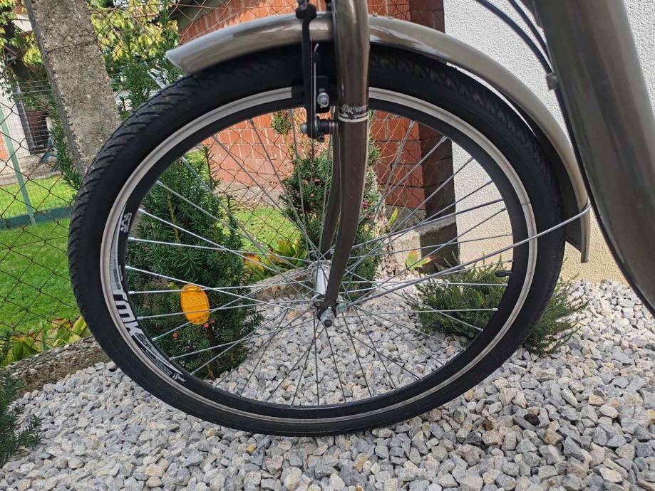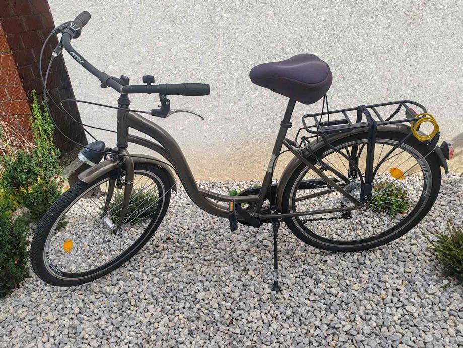 Svega nekoliko puta korišten gradski bicikl s klasičnim 28-inčnim kotačima. Opremljen je nogicom, blatobranima,prednjim i stražnjim svjetlom i nosačem, 6 brzina, pogodan za odrasle i starije osobe.