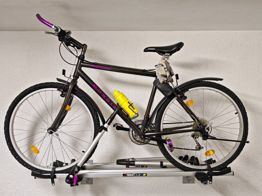 Prodajem rabljeni Mondial gradski bicikl u crnoj boji s ljubičastim detaljima koji dolazi s kvalitetnim Thule Tour nosačem za automobil. U ponudu je uključen i praktičan zidni nosač za bicikl, savršen komplet za svakog biciklista.