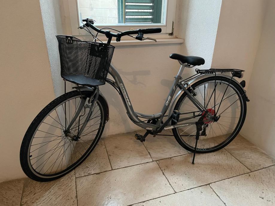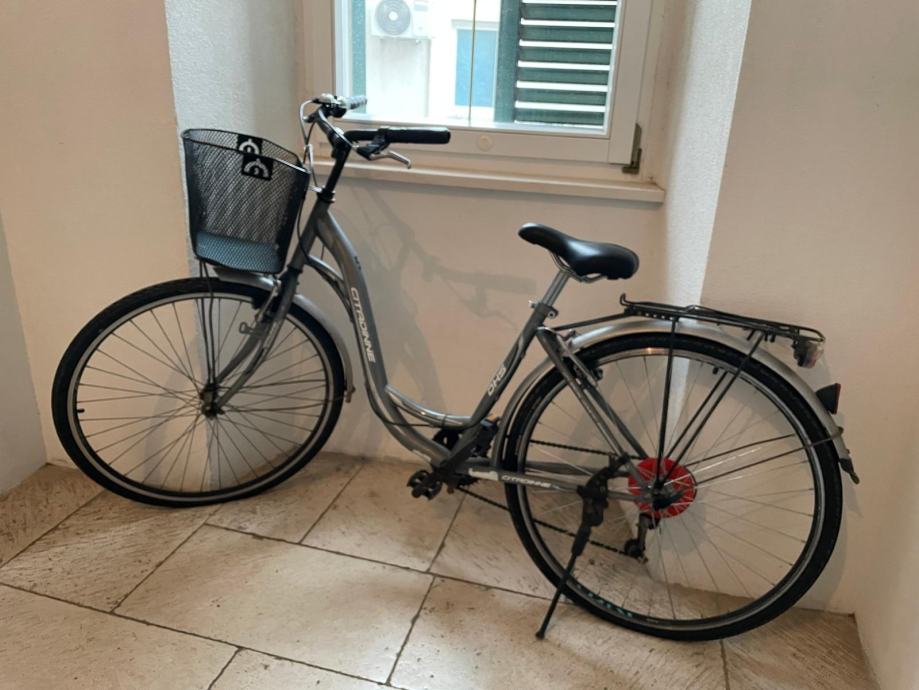 Prodajem polovni gradski bicikl u sivoj boji s praktičnom košarom na upravljaču. Bicikl ima klasičan ženski okvir s niskim ulazom, što olakšava uzjahivanje i sjahivanje. Opremljen je stražnjim nosačem za prtljagu, blatobranima i nožnom kočnicom. Košara na prednjoj strani korisna je za svakodnevne obaveze i transport manjih stvari. Bicikl ima više brzina i standardnu opremu za vožnju po gradu.