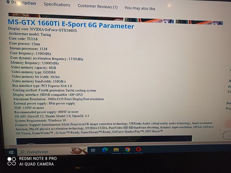 -za 200 eura=1.506,90kn NVIDIA GeForce GTX1660 6GB GDDR6 192-bit,12nm,Directx 12,1530-1785MHz,1408 CUDA jezgri(SP),video mem.frekv.14000MHz,336GB/s,PCI Express 3.0,max.rezol.7680x4320 piksela DP rezol.;8Pin,Direct x12, ...NOVO garanc. proizv. 3 godine