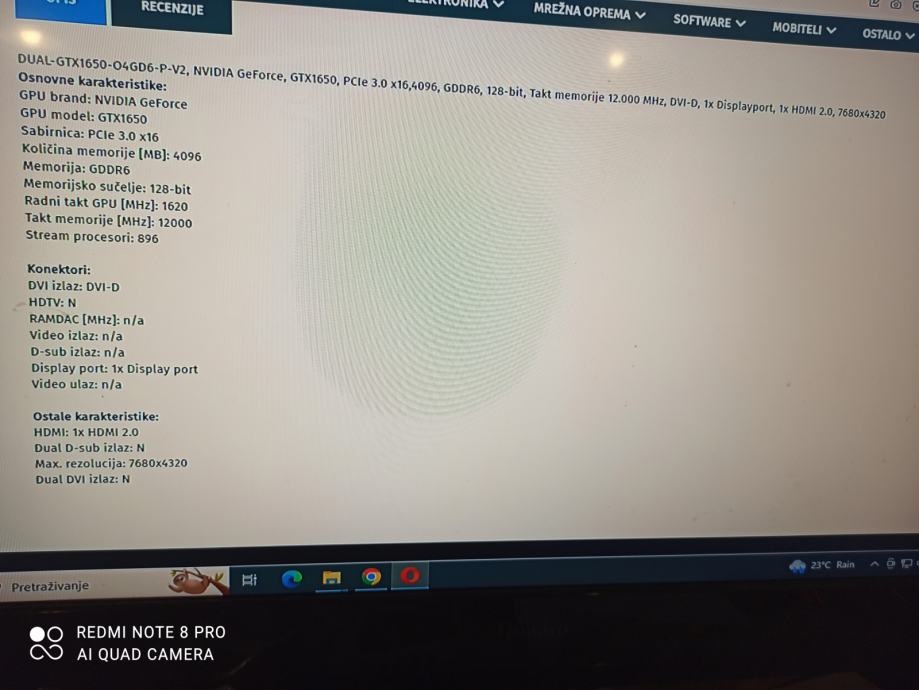 -za 200 eura=1.506,90kn ASUS DUAL GeForce GTX 1650 4GB 128-bit,12nm,DirectX 12,OpenGL 4.5,1485-1695MHz takt procesora,896 CUDA jezgri,8002MHz,max.digit.rezol.7680x4320 pix.izlazi:1xDVI,!xHDMI 2.0,1xDP 1.4,HDCP Support 2.2,najviše 3 zaslona,minim.napajanje 300W,PCI Express 3.0; 2 ventilatora za hlađenje,IP5X otpornost protiv prašine,Auto-Extreme tehnologija,ASUS GPU Tweak II besplatni sofver za bolji pregled statusa i performansi grafičke kartice za jednostavno rukovanje i namatanje ...NOVO 2 godine garancije