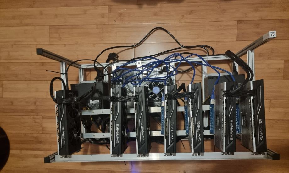 Mining rig , 2 ista, po 7 GPU Radeon Sapphire RX 580 , 8 GB, po dva napajanja Rog Strix 750W, MB Asus Prime B365 Plus, SSD Kingston 240 GB, RAM Kingston ddr4 8 GB. Hashrate svaki 190 MHs. Radi mirno i bez velikih opterećenja. Potrošnja jednog 770 W. Moguća prodaja pojedinačno kartica ili Zamjena za Nintendo Switch OLED