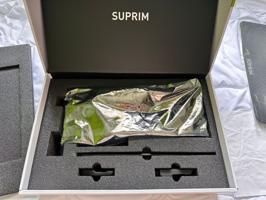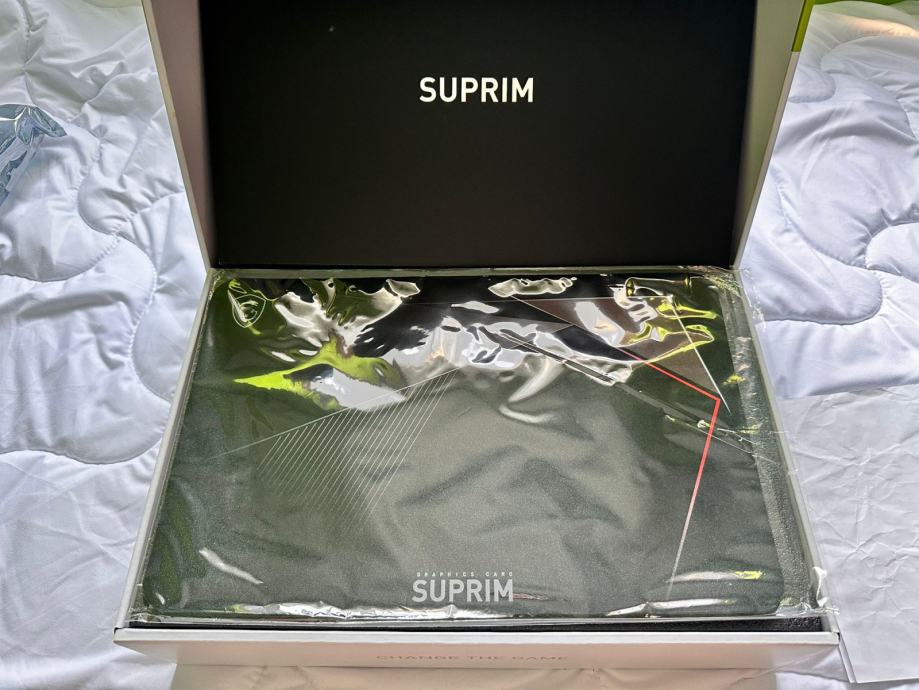 Uz karticu dajem originalno pakiranje - kutija, crna kuverta sa uputama i još nekim papirima, držač kartice, anti-statička folija, kartica sa sva 4 gumena poklopca za HDMI/DP, te zaštitom za PCI-E i MSI SuprimX podloga za miš (nekorištena).
