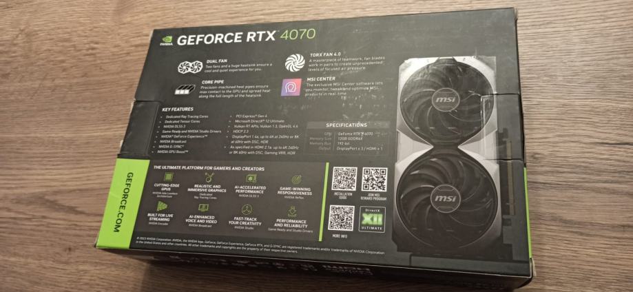 Prodajem novu grafičku karticu MSI RTX 4070 Ventus 2x 12GB VRAM-a. Grafička koristi 12GB DDR6X VRAM, 192-bit memory bus te koristi 1 HDMI i 3 DP outputa.