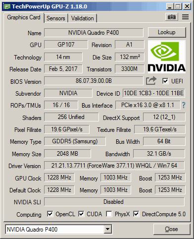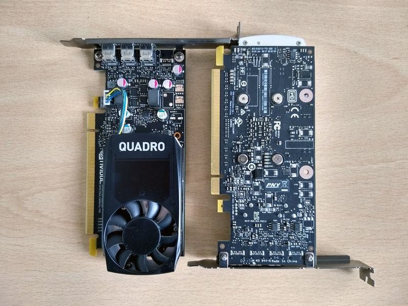 Pascal GPU. 2GB DDR5 RAM, CUDA jezgara 256, PCI-E 3.0 x16, TDP 30W, maksimalna rezolucija 3x 4096x2160 @ 60Hz ili 1x 5120x2880 @ 60Hz, 3x miniDP 1.4 izlaza (podržava DP odnosno DVI i VGA s adapterima), HDCP 2.2 podrška, NVIDIA Iray i MentalRay podrška.