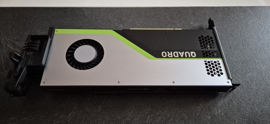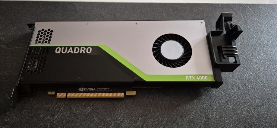 Na slici je prikazana NVIDIA Quadro RTX 4000, profesionalna grafička kartica dizajnirana za zahtjevne radne procese poput vizualnog računarstva, CAD-a, 3D modeliranja i umjetne inteligencije.