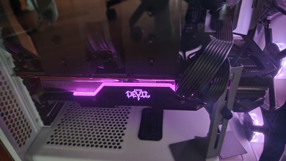 Temperatura grafičke nakon par sati igranja Cyberpunk-a je oko 85°C. FPS u Cyberpunk-u na "High Preset" varira između 60-110, ovisno o sceni. Nažalost nemam kutiju jer sam ju dobio od frenda. Dobije se i držač za grafičku. RGB na grafičkoj se može mijenjat mijenjat.