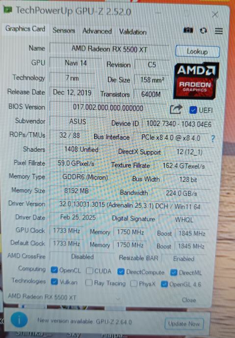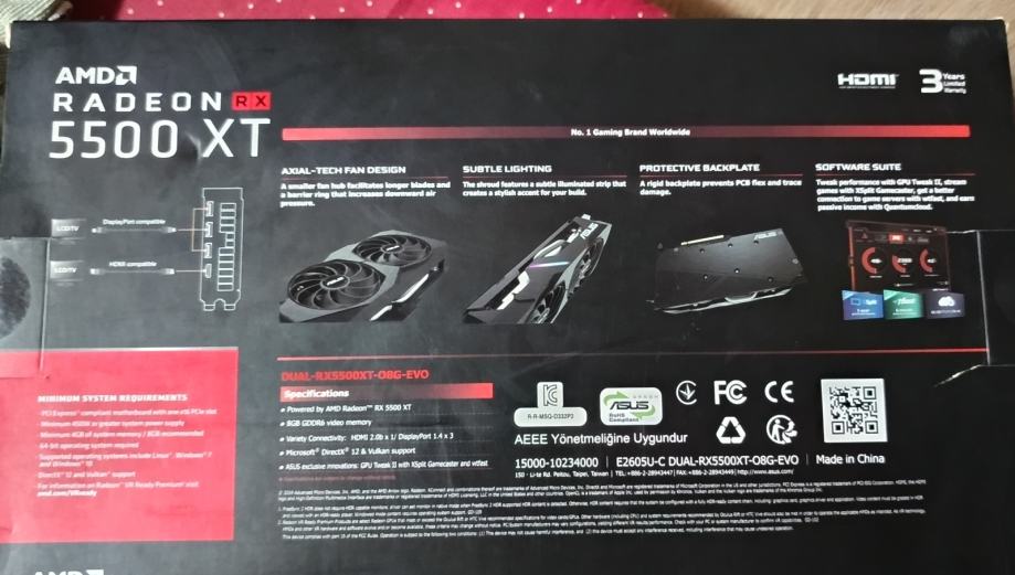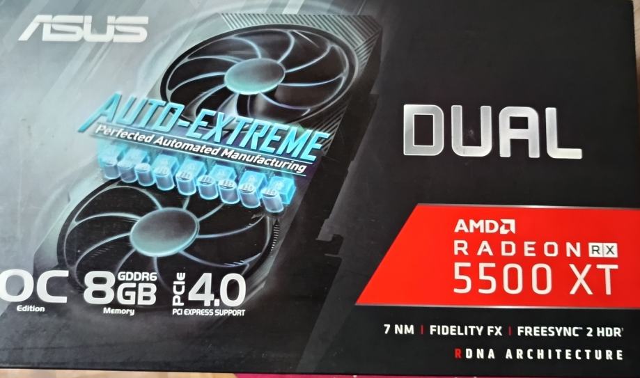 RX 5500XT ,8GB DDR6,kutija.Ispravna 100%.Prodajem jel sam uzeo jaču.Nikad Minala samo koristila za Igre.Mažena i pažena,čišćena redovno ,1put mjenjana termalna pasta MX4.Preferiram na ruke no moguće i HPom.