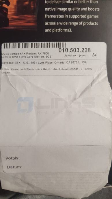 Prodajem XFX Radeon RX 7600 SWFT 210 Core Edition 8GB GDDR6 jer mi je višak. Kartica je uredna i ispravna, normalno korištena. Dolazi s originalnom kutijom.