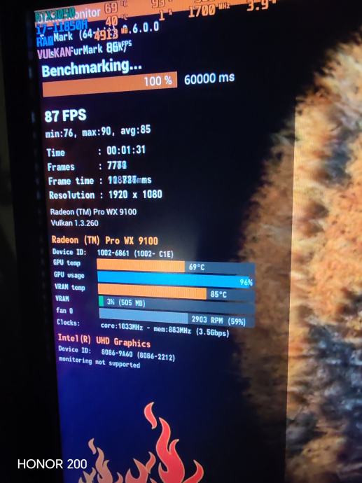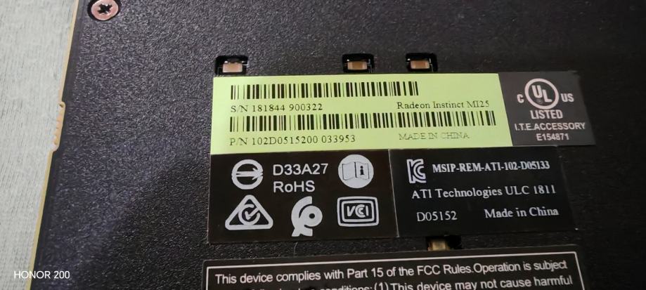 MI25 sa default biosom nema video izlaz iako ima mali dp koji se aktivira sa biosom od AMD Radeon Pro WX 9100 te daje sliku po defaultu MI25 nije imala aktivno hlađenje ali ima predviđeno mjesto za ugradnju ventilatora , ventilator sam ugradio i s ventilatorom iako je profesionalna graficka kartica sposobna je i da vrti igre ! Podrzava AMD adrenalin software te se u njemu moze podesavati jedino krivulja ventilatora nemoze se overclocati taktovi su zakljucani max 1500 MHz za gpu i max 945 MHz za rame rami su HBM2 ne ddr i ima sveukupno 16gb HBM2 rama
