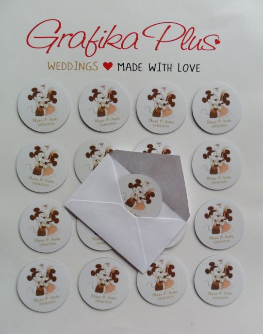 Magneti za vjenčanja su izrađeni od specijalnih magnetnih materijala na koje se aplicira željeni motiv tehnikom kolor tiska u vrhunskoj foto kvaliteti. Prednja strana magneta se dodatno plastificira sa sjajnom prozirnom folijom radi zaštite samog otiska i atraktivnijeg izgleda. Stražnja strane je "cijelom površinom" magnetna, tako da se magnet odlično drži za metalnu podlogu.