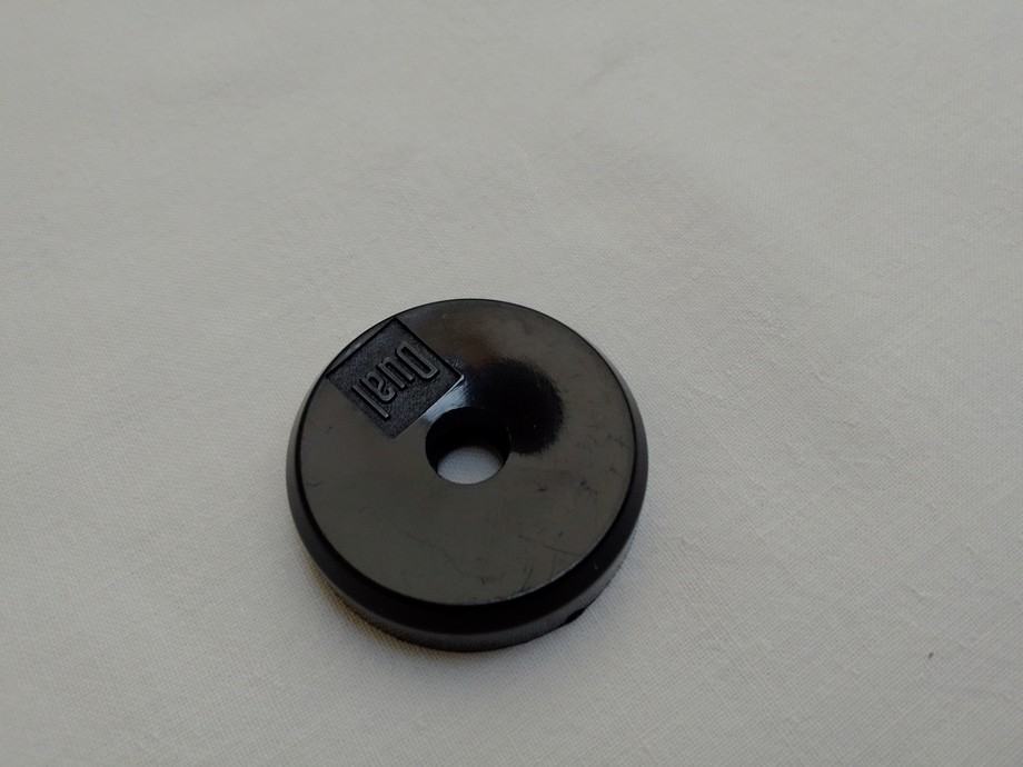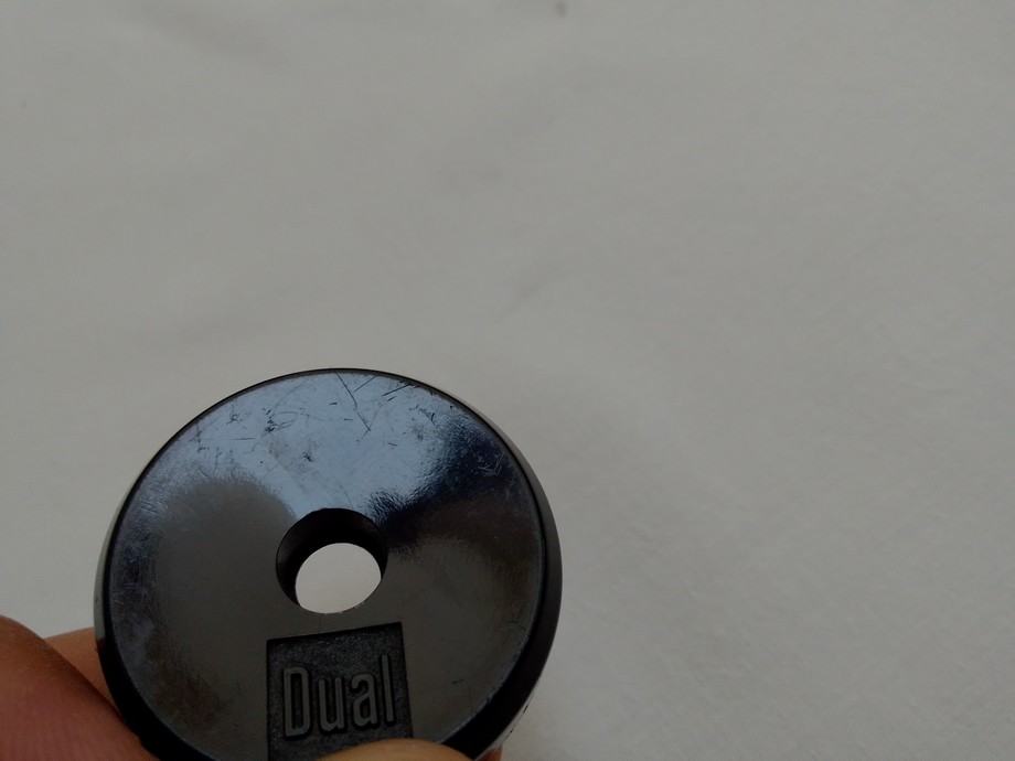 Prodajem neoštećen univerzalan adapter za centriranje singl ploča na tanjuru gramofona, pronađen uz Dual 1214 gramofon. Gornja ploha je stožastog oblika, visina ruba je 7 mm, visina grebena 10 mm, visina sredine par milimetara manja od tog, a promjer ruba standardan, 38 mm (1.5 inča).
