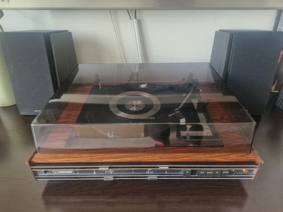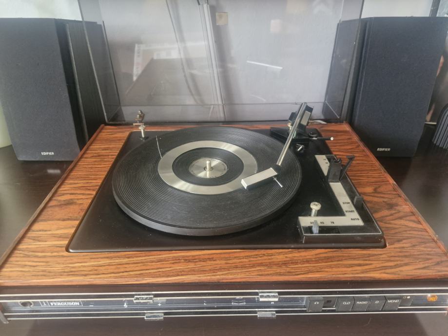 Prodajem vintage Ferguson gramofon. Gramofon se pali, mehanizam za automatsko micanje ručke također radi i tanjur se vrti, ali ručka je pukla, te fale zvucnica i igla. Osim toga, plastični poklopac je na jednom dijelu napukao, te gumeni dio tanjura je nabubren. Slike svih ostecenja su priložene, a gramofon je predviđen da se proda za dijelove ili ukoliko neko skuplja starine ili se eventualno bavi restauracijom i popravcima ovakvih artikala.