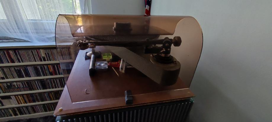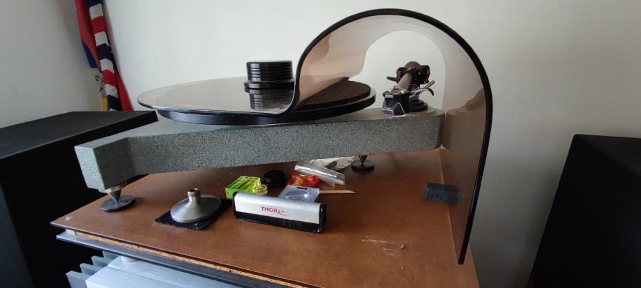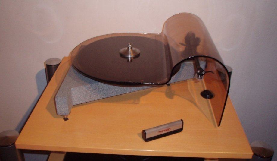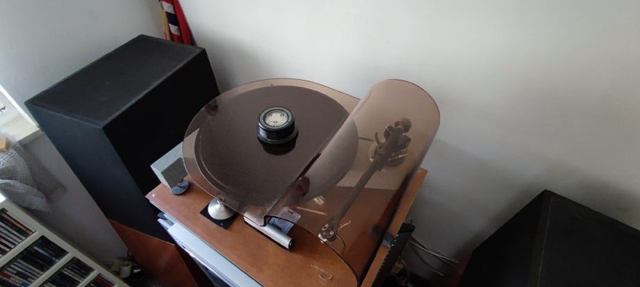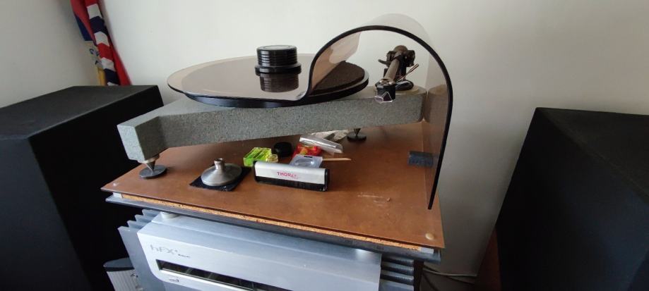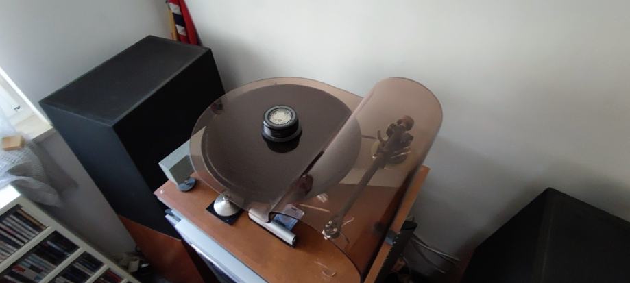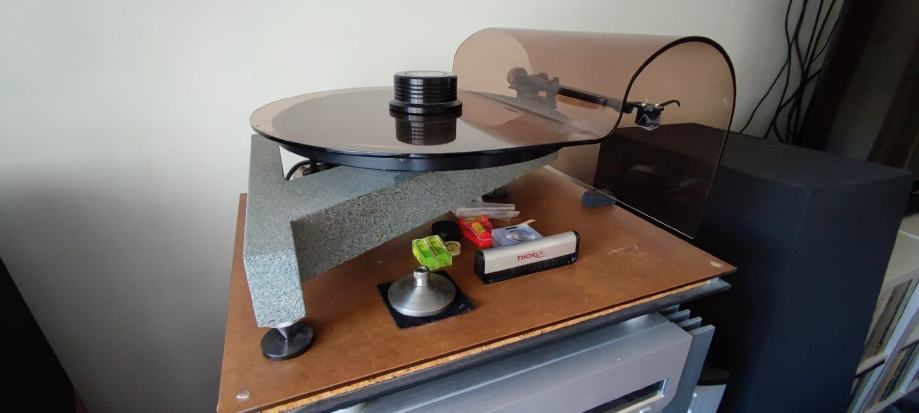 Gramofon se sastoji od : baze, odvojeni motor , ručka Rega RB-300 sa Cardas kabelom , odvojeno napajanje trafo 110v , clamp , plexi zaštita, reduktor 45 obrtaja , zvučnica Denon DL-103 sa promijenjenom iglom (Benz MC Glider). Igla je promijenjena u tvornici Benza u Švicarskoj (imam papire sa svih mjerenja).